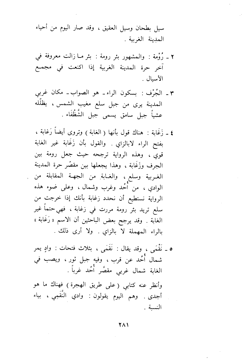 4 - زُغَابَةَ: هُنَاكَ قَوْلٌ بِأَنَّهَا (الْغَابَةُ) وَتُرْوَى أَيْضًا رَغَابَةُ، بِفَتْحِ الرَّاءِ لَا بِالزَّايِ. وَالْقَوْلُ بِأَنَّ زَغَابَةَ غَيْرُ الْغَابَةِ قَوِيٌّ، وَهَذِهِ الرِّوَايَةُ تُرَجِّحُهُ حَيْثُ جَعَلَ رُومَةَ بَيْنَ الْجُرْفِ وَزُغَابَةَ، وَهَذَا يَجْعَلُهَا بَيْنَ مَقْصَرِ حَرَّةِ الْمَدِينَةِ الْغَرْبِيَّةِ وَسَلْعٌ، وَالْغَابَةُ مِنْ الْجِهَةِ الْمُقَابِلَةِ مِنْ الْوَادِي، مِنْ أُحُدٍ وَغَرْبٍ وَشَمَالٍ، وَعَلَى ضَوْءِ هَذِهِ الرِّوَايَةِ نَسْتَطِيعُ أَنْ نُحَدِّدَ زَغَابَةَ بِأَنَّك إذَا خَرَجْت مِنْ سَلْعٍ تُرِيدُ بِئْرَ رُومَةَ مَرَرْت فِي زَغَابَةَ، فَهِيَ حَتْمًا غَيْرُ الْغَابَةِ. وَقَدْ يُرَجِّحُ بَعْضُ الْبَاحِثِينَ أَنَّ الِاسْمَ «رَغَابَةُ» بِالرَّاءِ الْمُهْمَلَةِ لَا بِالزَّايِ. وَلَا أَرَى ذَلِك.