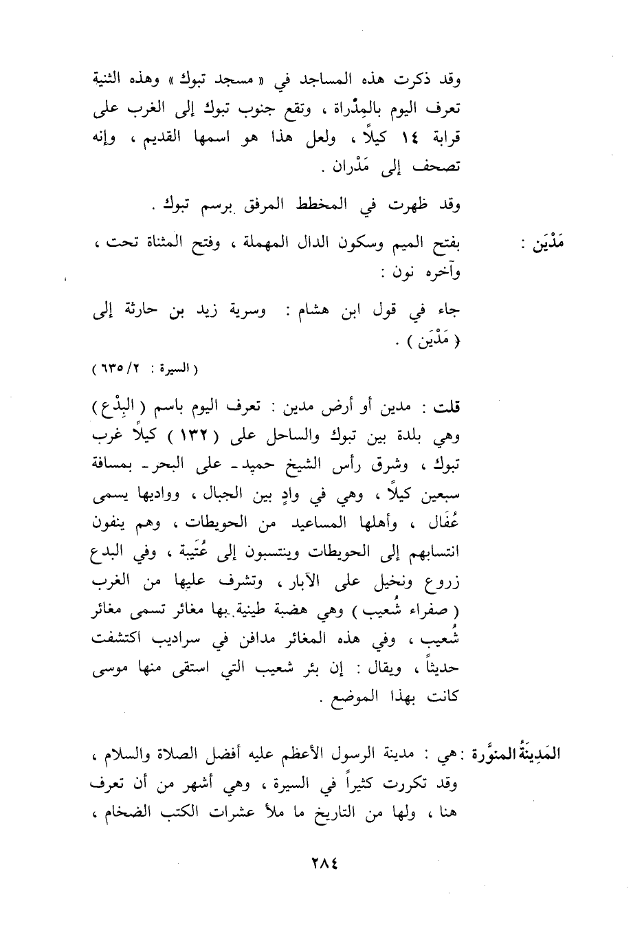 قُلْت: مَدْيَنُ أَوْ أَرْضُ مَدَيْنَ: تُعْرَفُ الْيَوْمَ بِاسْمِ (الْبِدْعِ) وَهِيَ بَلْدَةٌ بَيْنَ تَبُوكَ وَالسَّاحِلِ عَلَى (132) كَيْلًا غَرْبَ تَبُوكَ، وَشَرْقَ رَأْسِ الشَّيْخِ حُمَيْدٍ - عَلَى الْبَحْرِ - بِمَسَافَةِ سَبْعِينَ كَيْلًا، وَهِيَ فِي وَادٍ بَيْنَ الْجِبَالِ، وَوَادِيهَا يُسَمَّى عُفَالٌ، وَأَهْلُهَا الْمَسَاعِيدُ مِنْ الْحُوَيْطَاتِ، وَهُمْ يَنْفُونَ انْتِسَابَهُمْ إلَى الْحُوَيْطَاتِ وَيَنْتَسِبُونَ إلَى عُتَيْبَةَ، وَفِي الْبِدَعِ زُرُوعٌ وَنَخِيلٌ عَلَى الْآبَارِ، وَتُشْرِفُ عَلَيْهَا مِنْ الْغَرْبِ (صَفْرَاءُ شُعَيْبٍ) وَهِيَ هَضْبَةٌ طِينِيَّةٌ بِهَا مَغَائِرُ تُسَمَّى مَغَائِرَ شُعَيْبٍ، وَفِي هَذِهِ الْمَغَائِرِ مَدَافِنُ فِي سَرَادِيبَ اُكْتُشِفَتْ حَدِيثًا، وَيُقَالُ: إنَّ بِئْرَ شُعَيْبٍ الَّتِي اسْتَقَى مِنْهَا مُوسَى كَانَتْ بِهَذَا الْمَوْضِعِ.
