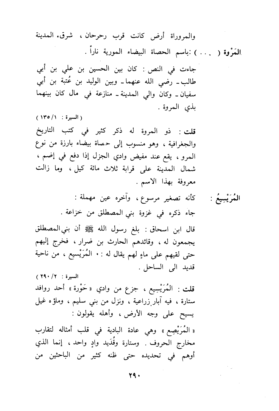 قُلْت: ذُو الْمَرْوَةِ لَهُ ذِكْرٌ كَثِيرٌ فِي كُتُبِ التَّارِيخِ وَالْجُغْرَافِيَا، وَهُوَ مَنْسُوبٌ إلَى حَصَاةٍ بَيْضَاءَ بَارِزَةٍ مِنْ نَوْعِ الْمَرْوِ، يَقَعُ عِنْدَ مَفِيضِ وَادِي الْجَزْلِ إذَا دَفَعَ فِي إضَمٍ، شَمَالَ الْمَدِينَةِ عَلَى قَرَابَةِ ثَلَاثِ مِائَةِ كَيْلٍ، وَمَا زَالَتْ مَعْرُوفَةً بِهَذَا الِاسْمِ.