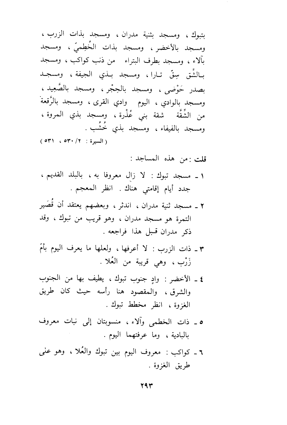 بِتَبُوكَ، وَمَسْجِدٌ بِثَنِيَّةِ مَدْرَانَ، وَمَسْجِدٌ بِذَاتِ الزَّرْبِ، وَمَسْجِدٌ بِالْأَخْضَرِ، وَمَسْجِدٌ بِذَاتِ الْخَطْمِيِّ، وَمَسْجِدٌ بِآلَاءَ، وَمَسْجِدٌ بِطَرَفِ الْبَتْرَاءِ مِنْ ذَنَبِ كَوَاكِبَ، وَمَسْجِدٌ بِالشَّقِّ شَقِّ تَارًّا، وَمَسْجِدٌ بِذِي الْجِيفَةِ، وَمَسْجِدٌ بِصَدْرِ حَوْضَى، وَمَسْجِدٌ بِالْحِجْرِ، وَمَسْجِدٌ بِالصَّعِيدِ، وَمَسْجِدٌ بِالْوَادِي، الْيَوْمَ وَادِي الْقُرَى، وَمَسْجِدٌ بِالرُّقْعَةِ مِنْ الشِّقَّةِ شِقَّةِ بَنِي عُذْرَةَ، وَمَسْجِدٌ بِذِي الْمَرْوَةِ، وَمَسْجِدٌ بِالْفَيْفَاءِ، وَمَسْجِدٌ بِذِي خُشُبٍ.