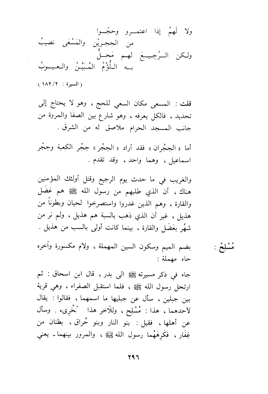 أَمَّا «الْحِجْرَانِ» فَقَدْ أَرَادَ «الْحِجْرَ» حِجْرَ الْكَعْبَةِ وَحِجْرَ إسْمَاعِيلَ، وَهُمَا وَاحِدٌ، وَقَدْ تَقَدَّمَ. وَالْغَرِيبُ فِي مَا حَدَثَ يَوْمَ الرَّجِيعِ وَقَتْلُ أُولَئِكَ الْمُؤْمِنِينَ هُنَاكَ، أَنَّ الَّذِي طَلَبَهُمْ مِنْ رَسُولِ اللَّهِ صَلَّى اللَّهُ عَلَيْهِ وَسَلَّمَ هُمْ عَضَلٌ وَالْقَارَةُ، وَهُمْ الَّذِينَ غَدَرُوا وَاسْتَصْرَخُوا لِحْيَانَ وَبُطُونًا مِنْ هُذَيْلٍ، غَيْرَ أَنَّ الَّذِي ذَهَبَ بِالسُّبَّةِ هُمْ هُذَيْلٌ، وَلَمْ نَرَ مَنْ شَهَّرَ بِعَضَلِ وَالْقَارَةِ، بَيْنَمَا كَانَتْ أَوْلَى بِالسَّبِّ مِنْ هُذَيْلٍ.