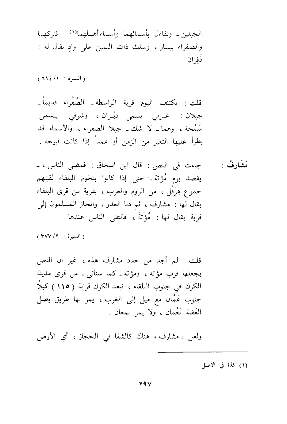 مَشَارِفُ جَاءَتْ فِي النَّصِّ: قَالَ ابْنُ إسْحَاقَ: فَمَضَى النَّاسُ، - يَقْصِدُ يَوْمَ مُؤْتَةَ - حَتَّى إذَا كَانُوا بِتُخُومِ الْبَلْقَاءِ لَقِيَتْهُمْ جُمُوعُ هِرَقْلَ، مِنْ الرُّوم ِ وَالْعَرَبِ، بِقَرْيَةِ مِنْ قُرَى الْبَلْقَاءِ يُقَالُ لَهَا: مَشَارِفُ، ثُمَّ دَنَا الْعَدُوُّ، وَانْحَازَ الْمُسْلِمُونَ إلَى قَرْيَةٍ يُقَالُ لَهَا: مُؤْتَةُ، فَالْتَقَى النَّاسُ عِنْدَهَا.