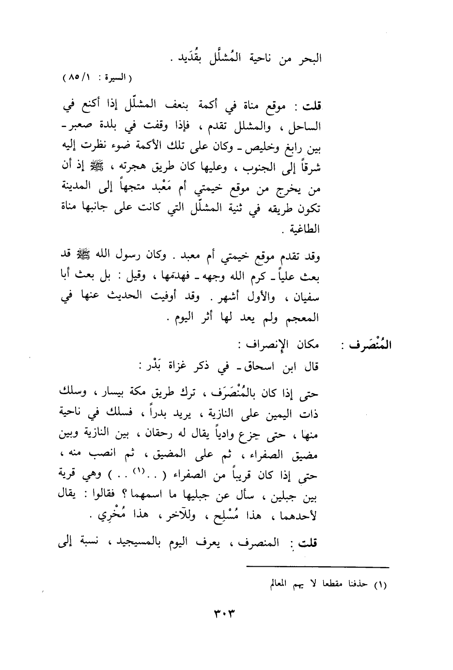 قُلْت: مَوْقِعُ مَنَاةَ فِي أَكَمَةٍ بِنَعْفِ الْمُشَلَّلِ إذَا أَكْنَعَ فِي السَّاحِلِ، وَالْمُشَلَّلُ تَقَدَّمَ، فَإِذَا وَقَفْت فِي بَلْدَةِ صعبر - بَيْنَ رَابِغٍ وَخُلَيْصٍ - وَكَانَ عَلَى تِلْكَ الْأَكَمَةِ ضَوْءٌ نَظَرْت إلَيْهِ شَرْقًا إلَى الْجَنُوبِ، وَعَلَيْهَا كَانَ طَرِيقُ هِجْرَتِهِ، صَلَّى اللَّهُ عَلَيْهِ وَسَلَّمَ إذْ أَنَّ مَنْ يَخْرُجُ مِنْ مَوْقِعِ خَيْمَتَيْ أُمِّ مَعْبَدٍ مُتَّجِهًا إلَى الْمَدِينَةِ تَكُونُ طَرِيقَهُ فِي ثَنِيَّةِ الْمُشَلَّلِ الَّتِي كَانَتْ عَلَى جَانِبِهَا مَنَاةُ الطَّاغِيَةُ.