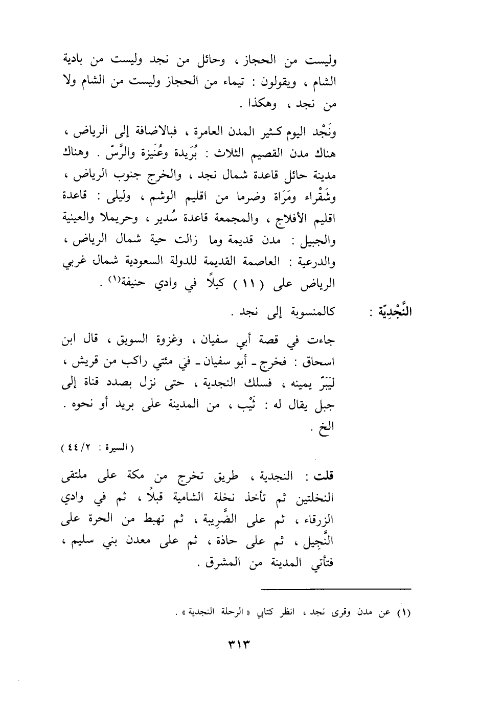 قُلْت: النَّجْدِيَّةُ، طَرِيقٌ تَخْرُجُ مِنْ مَكَّةَ عَلَى مُلْتَقَى النَّخْلَتَيْنِ ثُمَّ تَأْخُذُ نَخْلَةُ الشَّامِيَّةُ قِبَلًا، ثُمَّ فِي وَادِي الزَّرْقَاءِ، ثُمَّ عَلَى الضَّرِيبَةِ، ثُمَّ تَهْبِطُ مِنْ الْحَرَّةِ عَلَى النُّجَيْلِ، ثُمَّ عَلَى حَاذَّةَ، ثُمَّ عَلَى مَعْدِنِ بَنِي سُلَيْمٍ، فَتَأْتِي الْمَدِينَةَ مِنْ الْمَشْرِقِ.