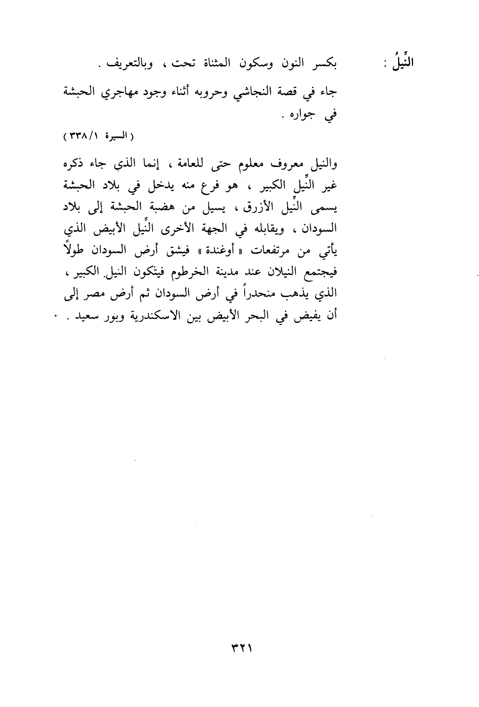 وَالنِّيلُ مَعْرُوفٌ مَعْلُومٌ حَتَّى لِلْعَامَّةِ، إنَّمَا الَّذِي جَاءَ ذِكْرُهُ غَيْرُ النِّيلِ الْكَبِيرِ، هُوَ فَرْعٌ مِنْهُ يَدْخُلُ فِي بِلَادِ الْحَبَشَةِ يُسَمَّى النِّيلَ الْأَزْرَقَ، يَسِيلُ مِنْ هَضْبَةِ الْحَبَشَةِ إلَى بِلَادِ السُّودَانِ، وَيُقَابِلُهُ فِي الْجِهَةِ الْأُخْرَى النِّيلُ الْأَبْيَضُ الَّذِي يَأْتِي مِنْ مُرْتَفَعَاتِ «أُوغَنْدَة» فَيَشُقُّ أَرْضَ السُّودَانِ طُولًا فَيَجْتَمِعُ النِّيلَانِ عِنْدَ مَدِينَةِ الْخُرْطُومِ فَيَتَكَوَّنُ النِّيلُ الْكَبِيرُ، الَّذِي يَذْهَبُ مُنْحَدِرًا فِي أَرْضِ السُّودَانِ ثُمَّ أَرْضِ مِصْرَ إلَى أَنْ يَفِيضَ فِي الْبَحْرِ الْأَبْيَضِ بَيْنَ الإسكندرية وَبُورْسَعِيدَ.