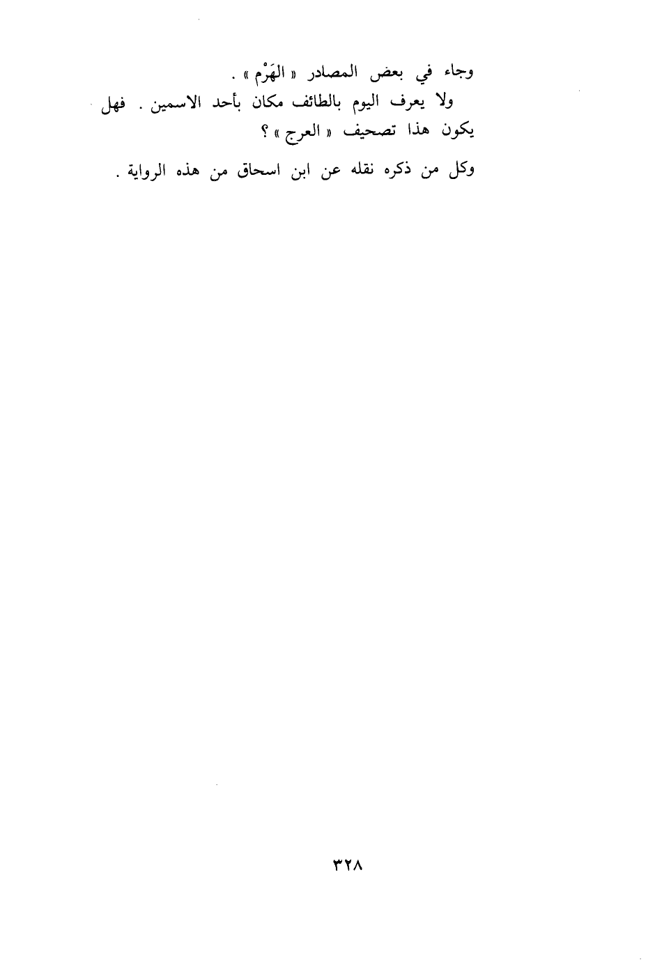وَجَاءَ فِي بَعْضِ الْمَصَادِرِ «الْهَرْمُ». وَلَا يُعْرَفُ الْيَوْمَ بِالطَّائِفِ مَكَانٌ بِأَحَدِ الِاسْمَيْنِ. فَهَلْ يَكُونُ هَذَا تَصْحِيفَ «الْعَرْجِ»؟ وَكُلُّ مَنْ ذَكَرَهُ نَقَلَهُ عَنْ ابْنِ إسْحَاقَ مِنْ هَذِهِ الرِّوَايَةِ.