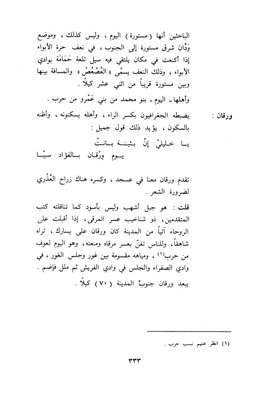 تَقَدَّمَ وَرْقَانُ مَعَنَا فِي عَسْجَدٍ، وَكَسَرَهُ هُنَاكَ زَرَاحٌ الْعُذْرِيُّ لِضَرُورَةِ الشِّعْرِ. قُلْت: هُوَ جَبَلٌ أَشْهَبُ وَلَيْسَ بِأَسْوَدَ كَمَا تَنَاقَلَتْهُ كُتُبُ الْمُتَقَدِّمِينَ، ذُو شَنَاخِيبَ عَسِرُ الْمَرْقَى، إذَا أَقْبَلْت عَلَى الرَّوْحَاءِ آتِيًا مِنْ الْمَدِينَةِ كَانَ وَرْقَانُ عَلَى يَسَارِك، تَرَاهُ شَاهِقًا، وَلِلنَّاسِ تَغَنٍّ بِعُسْرِ مَرَقَاهُ وَمَنْعَتِهِ، وَهُوَ الْيَوْمَ لِعَوْفٍ مِنْ حَرْبٍ، وَمِيَاهُهُ مَقْسُومَةٌ بَيْنَ غَوْرٍ وَجِلْسَ الْغَوْرُ، فِي وَادِي الصَّفْرَاءِ وَالْجِلْسُ فِي وَادِي الْفُرَيْشِ ثُمَّ مَلَلٍ فَإِضَمٍ. يَبْعُدُ وَرْقَانُ جَنُوبَ الْمَدِينَةِ (70) كَيْلًا.