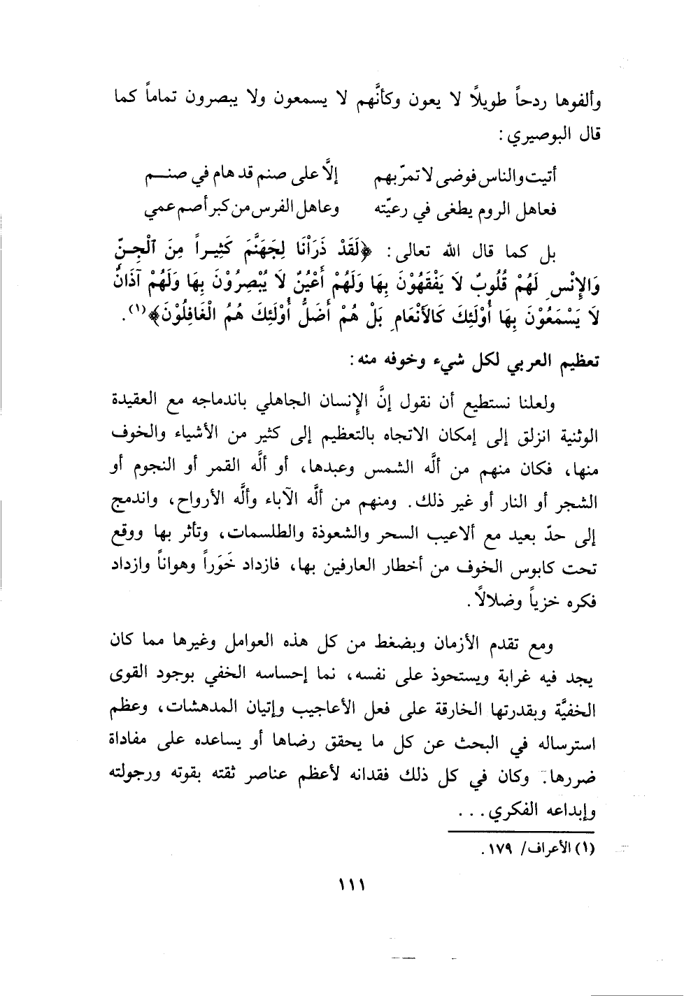 أتيت والناس فوضى تمر بهم إلا على صنم قد هام في صنم فعاهل الروم يطغى في رعيته وعاهل الفرس من كبر أصم عمي بل كما قال الله تعالى: (لقد ذرأنا لجهنم كثيراً من الجن والإنس لهم قلوب لا يفقهون بها ولم أعين لا يبصرون بهاولهم آذان لا يسمعون بها أولئك كالأنعام بل هم أضلُ أولئك هم الغافلون) (1).