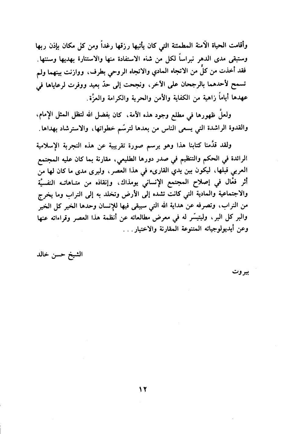 ولقد قدمنا كابنا هذا وهو يرسم صورة تقريبية عن هذه التجربة الإسلامية الرائدة في الحكم والنظيم في صدر دورها الطليعي، مقارنة بما كان عليه المجتمع العربي قبلها، ليكون بين يدي القارئ في هذا العصر، وليرى مدى ما كان لها من أثر فعال في إصلاح المجتمع الإنساني يومذاك، وإنقاذه من متاهاته النفسية والإجتماعية والمادية التي كانت تشده إلى الأرض وتخلد به إلى التراب وما يخرج من التراب، وتصرفه عن هداية الله التي سيبقى فيها للإنسان وحدها الخير كل الخير والبر كل البر، وليتيسر له في معرض مطالعاته عن أنظمة هذا العصر وقراءاته عنها وعن أيديولوجياته المتنوعة المقارنة والإختيار ...
