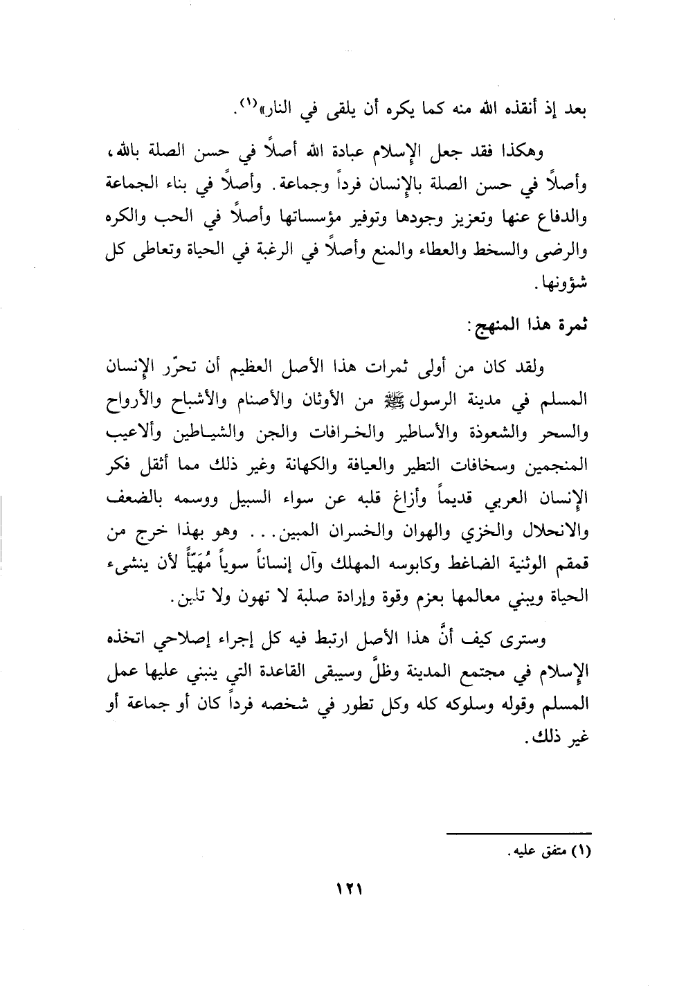 وسترى كيف أن هذا الأصل ارتبط فيه كل إجراء إصلاحي اتخذه الإسلام في مجتمع المدينة وظل وسيبقى القاعدة التي ينبني عليها عمل المسلم وقوله وسلوكه كله وكل تطور في شخصه فرداً كان أو جماعة أو غير ذلك.