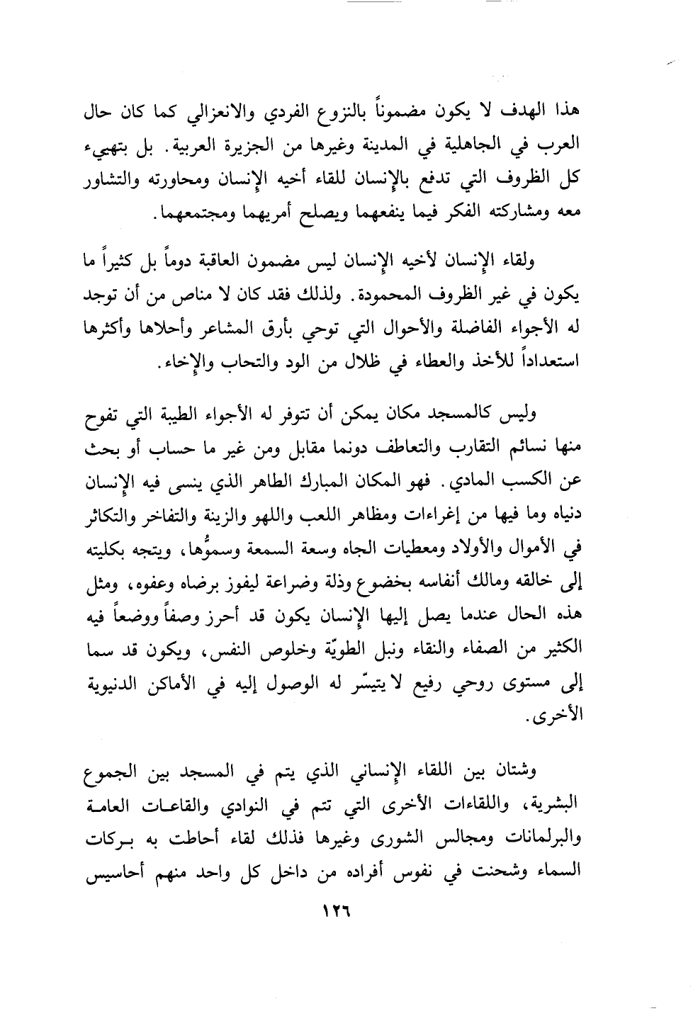 وشتان بين اللقاء الإنساني الذي يتم في المسجد بين الجموع البشرية، واللقاءات الأخرى التي تتم في النوادي والقاعات العامة والبرلمانات ومجالس الشورى وغيرها فذلك لقاء أحاطت به بركات السماء وشحنت في نفوس أفراده من داخل كل واحد منهم أحاسيس…