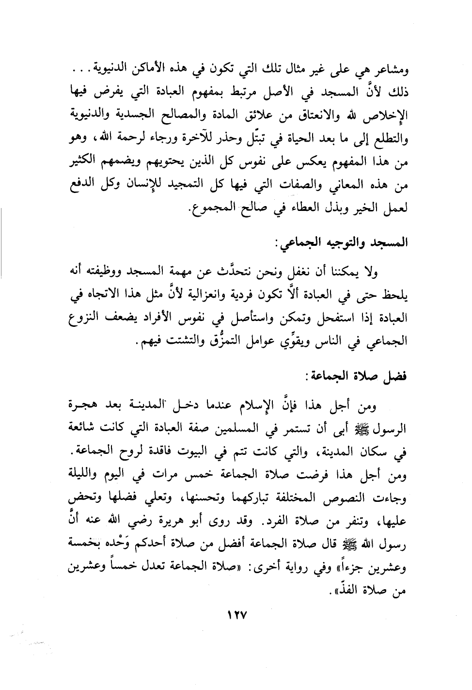 ولا يمكننا أن نغفل ونحن نتحدث عن مهمة المسجد ووظيفته أنه يلحظ حتى في العبادة ألا تكون فردية وانعزالية لأن مثل هذا الإتجاه في العبادة إذا استفحل وتمكن واستأصل في نفوس الأفراد يضعف النزوع الجماعي في الناس ويقوي عوامل التمزق والتشتت فيهم.