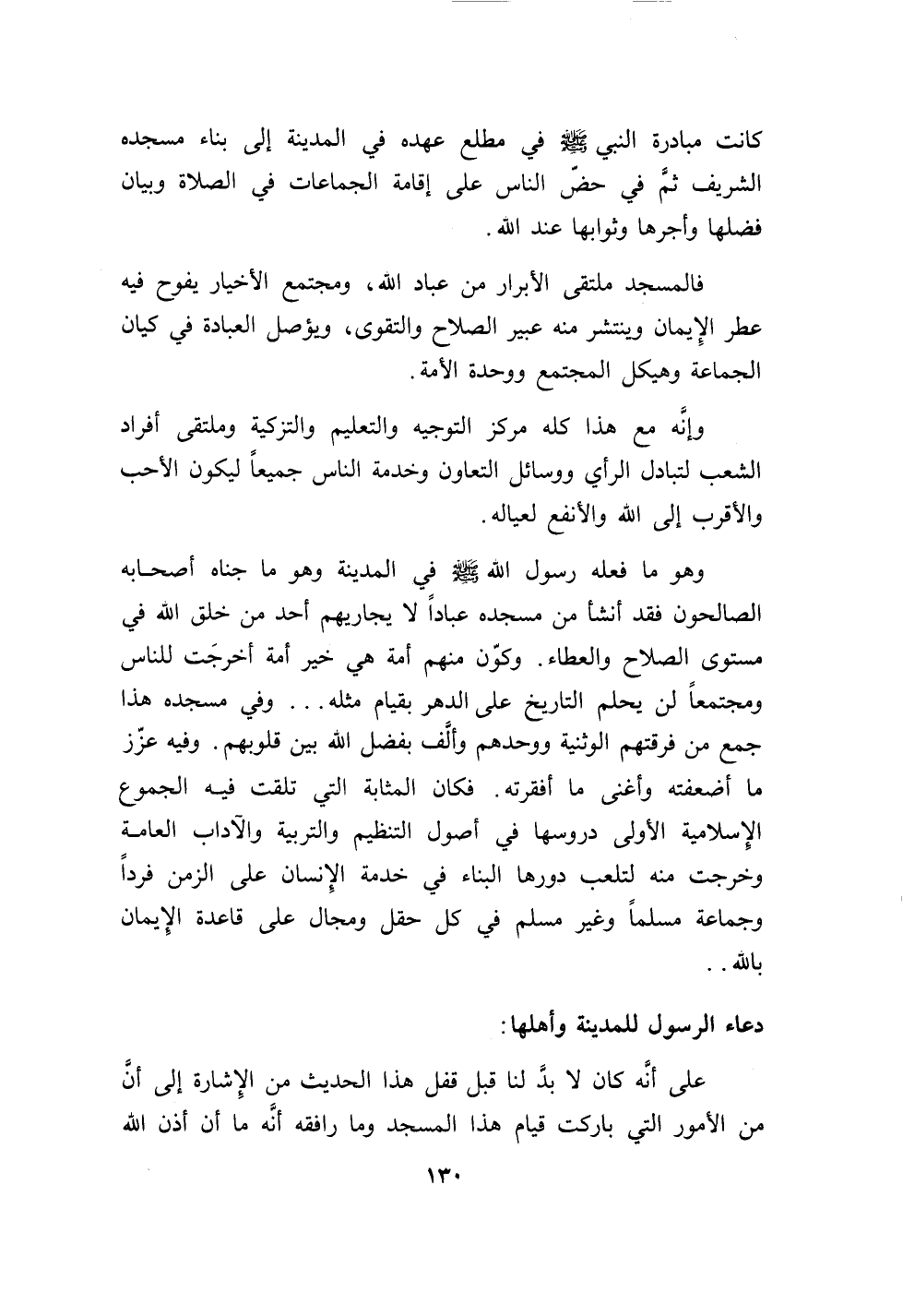 130…كانت مبادرة النبي صلى الله عليه وسلم في مطلع عهده في المدينة إلى بناء مسجده الشريف ثم في حض الناس على إقامة الجماعات في الصلاة وبيان فضلها وأجرها وثوابها عند الله.