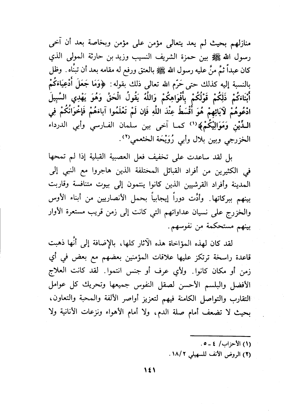141…منازلهم بحيث لم يعد يتعالى مؤمن على مؤمن وبخاصة بعد أن آخى رسول الله صلى الله عليه وسلم بين حمزة الشريف النسيب وزيد بن حارثة المولى الذي كان عبداً ثم من عليه رسول الله صلى الله عليه وسلم بالعتق ورفع له مقامه بعد أن تبناه.