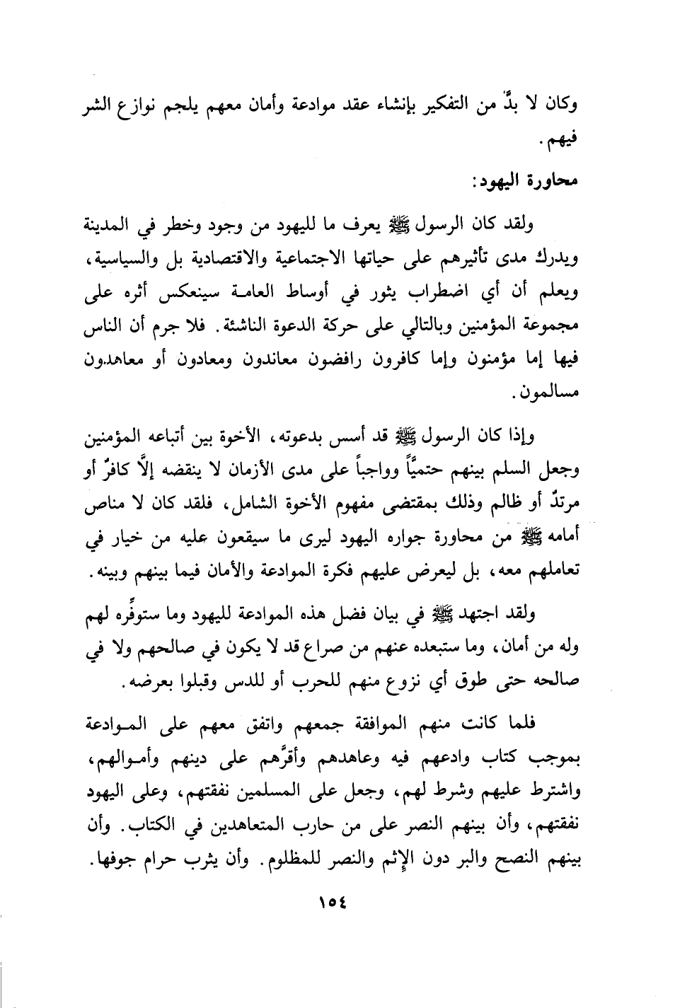 وإذا كان الرسول صلى الله عليه وسلم قد أسس بدعوته، الأخوة بين أتباعه المؤمنين وجعل السلم بينهم حتمياً وواجباً على مدى الأزمان لا ينقضه إلا كافر أو مرتدٌ أو ظالم وذلك بمقتضى مفهوم الأخوة الشامل، فلقد كان لا مناص أمامه صلى الله عليه وسلم من محاورة جواره اليهود ليرى ما سيقعون عليه من خيار في تعاملهم معه، بل ليعرض عليهم فكرة الموادعة والأمان فيما بينهم وبينه.