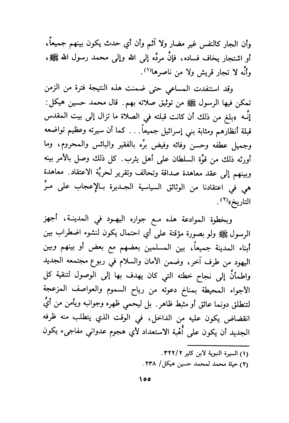 155…وأن الجار كالنفس غير مضار ولا آثم وأن أي حدث يكون بينهم جميعاً، أواشتجار يخاف فساده، فإن مرده إلى الله وغلى محمد رسول الله صلى الله عليه وسلم، وأنه لا تجار قريش ولا من ناصرها (1).