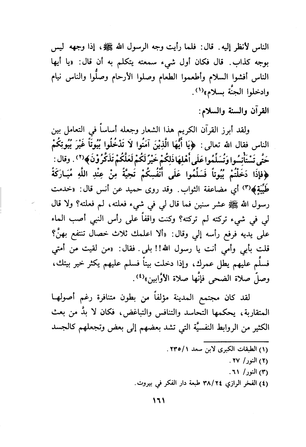 لقد كان مجتمع المدينة مؤلفاً من بطون متنافرة رغم أصولها المتقاربة، فحكمها التحاسد والتنافس والتباغض، فكان لا بد من بعث الكثير من الروابط النفسية التي تشد بعضهم إلى بعض وتجعلهم كالجسد…