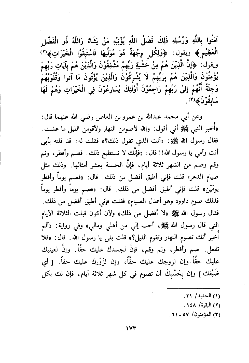 صم وأفطر، ونم وقم، فإن لجسدك عليك حقاً. وإن لعينيك عليك حقاً وإن لزوجك عليك حقاً، وإن لزورك عليك حقاً.