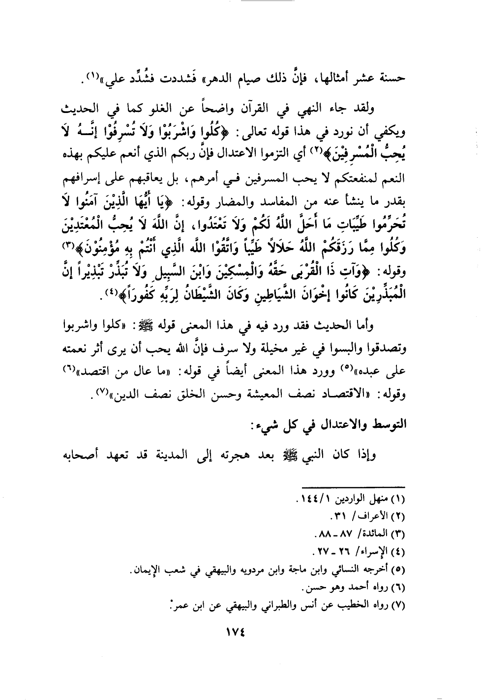 " (كلوا واشربوا ولا تسرفوا إنه لا يحب المسرفين) (2) أي التزموا الإعتدال فإن ربكم الذي أنعم عليكم بهذه النعم لمنفعتكم لا يحب المسرفين في أمرهم، بل يعاقبهم على إسرافهم بقدر ما ينشأ عنه من المفاسد والمضار وقوله: