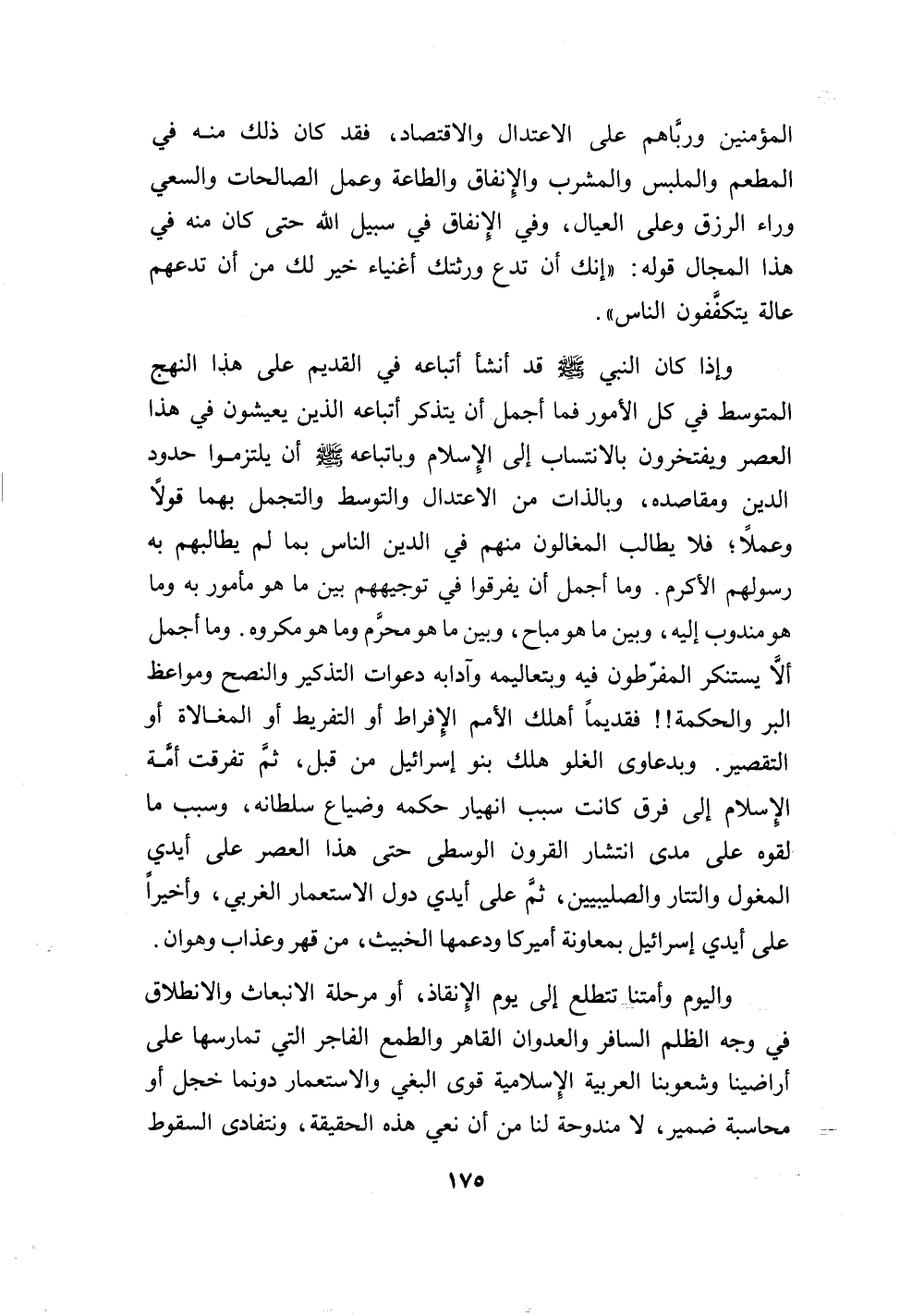175…المؤمنين ورباهم على الإعتدال والاقتصاد، فقد كان ذلك منه في المطعم والملبس والمشرب والإنفاق والطاعة وعمل الصالحات والسعي وراء الرزق وعلى العيال، وفي الإنفاق في سبيل الله حتى كان منه في هذا المجال قوله: