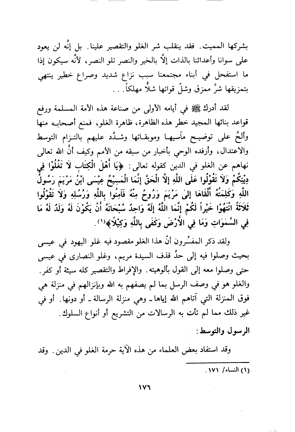 (يا أهل الكتاب لا تغلو في دينكم ولا تقولوا على الله إلا الحق إنما المسيح عيسى ابن مريم رسول الله وكلمته ألقاها إلى مريم وروحٌ منه فآمنوا بالله ورسله ولا تقولوا ثلاثة انتهوا خيراً لكم إنما الله إله واحد سبحانه أن يكون له ولد له ما في السموات وما في الأرض وكفى بالله وكيلاً) (1).