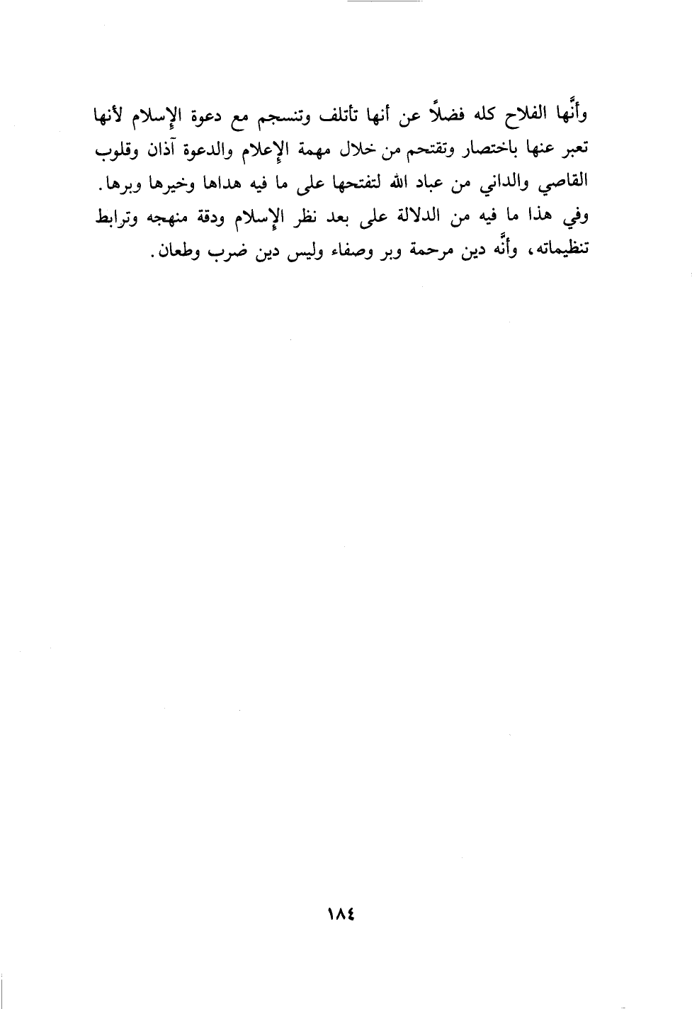 184…وأنها الفلاح كله فضلاً عن أنها تأتلف وتنسجم مع دعوة الإسلام لأنها تعبر عنها باختصار وتقتحم من خلال مهمة الإعلام والدعوة آذان وقلوب القاصي والداني من عباد الله لتفتحها على ما فيه هداها وخيرها وبرها.
