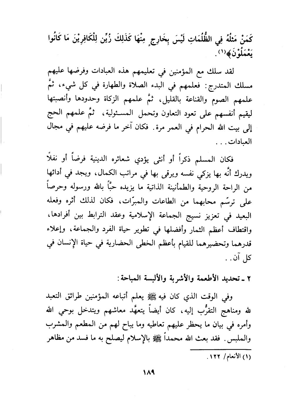 فعلمهم في البدء الصلاة والطهارة في كل شيء، ثم علمهم الصوم والقناعة بالقليل، ثم علمهم الزكاة وحدودها وأنصبتها لقيم أنفسهم على تعود التعاون وتحمل المسئولية، ثم علمهم الحج إلى بيت الله الحرام في العمر مرة.