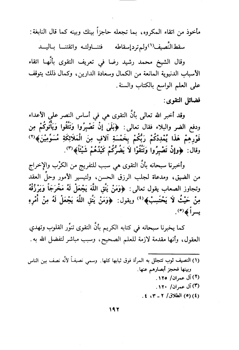 سقط النصيف (1) ولم ترد إسقاطه فتناولته واتقتنا باليد وقال الشيخ محمد رشيد رضا في تعريف التقوى بأنها اتقاء الأسباب الدنيوية المانعة من الكمال وسعادة الدارين، وكمال ذلك يتوقف على العلم الواسع بالكتاب والسنة.