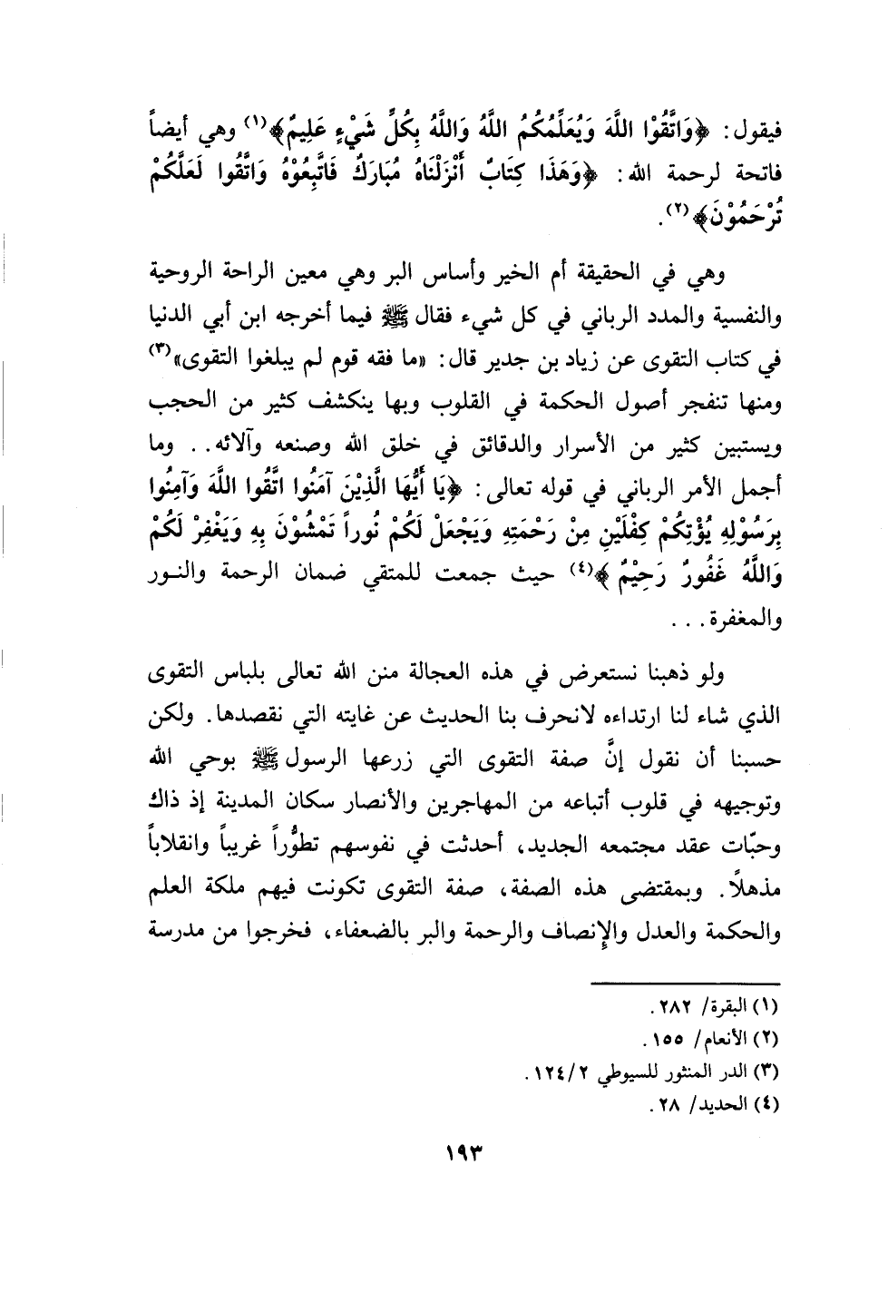 وهي في الحقيقة أم الخير واساس البر وهي معين الراحة الروحية والنفسية والمدد الرباني في كل شيء فقال صلى الله عليه وسلم فيما أخرجه ابن ابي الدنيا في كتاب التقوى عن زياد بن جدير قال: "ما فقه قوم لم يبلغوا التقوى" (3) دومنها تنفجر أصول الحكمة في القلوب وبها ينكشف كثير من الحجب ويستبين كثير من الأسرار والدقائق في خلق الله وصنعه وآلائه ..