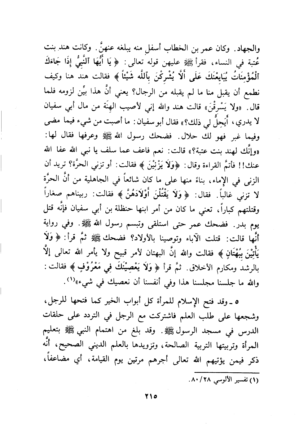 5 - وقد فتح الإسلام للمرأة كل أبواب الخير كمافتحها للرجل، وشجعها على طلب العلم فاشتركت مع الرجل في التردد على حلقات الدرس في مسجد الرسول صلى الله عليه وسلم.