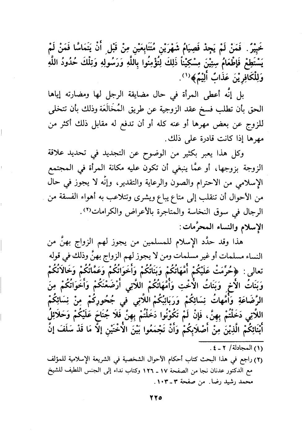 (2) راجع في هذا البحث كتاب أحكام الأحوال الشخصية في الشريعة الإسلامية للمؤلف مع الدكتور عدنان نجا من الصفحة 17 - 126 وكتاب نداء إلى الجنس اللطيف للشيخ محمد رشيد رضا. من صفحة 3 - 103.