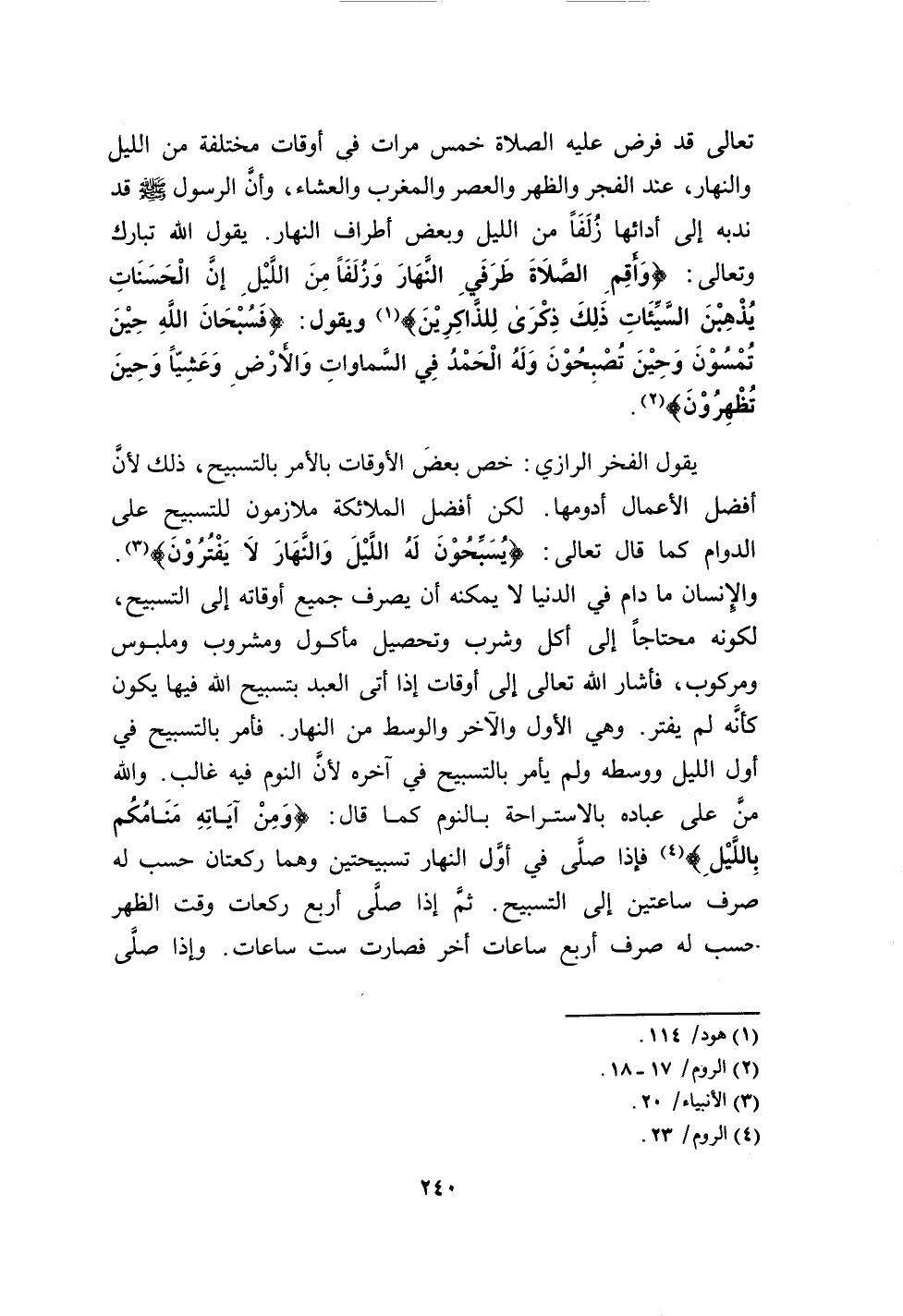 240…تعالى قد فرض عليه الصلاة خمس مرات في أوقات مختلفة من الليل والنهار، عند الفجر والظهر والعصر والمغرب والعشاء، وأن الرسول صلى الله عليه وسلم قد ندبه إلى أدائها زلفاً من الليل وبعض أطراف النهار.