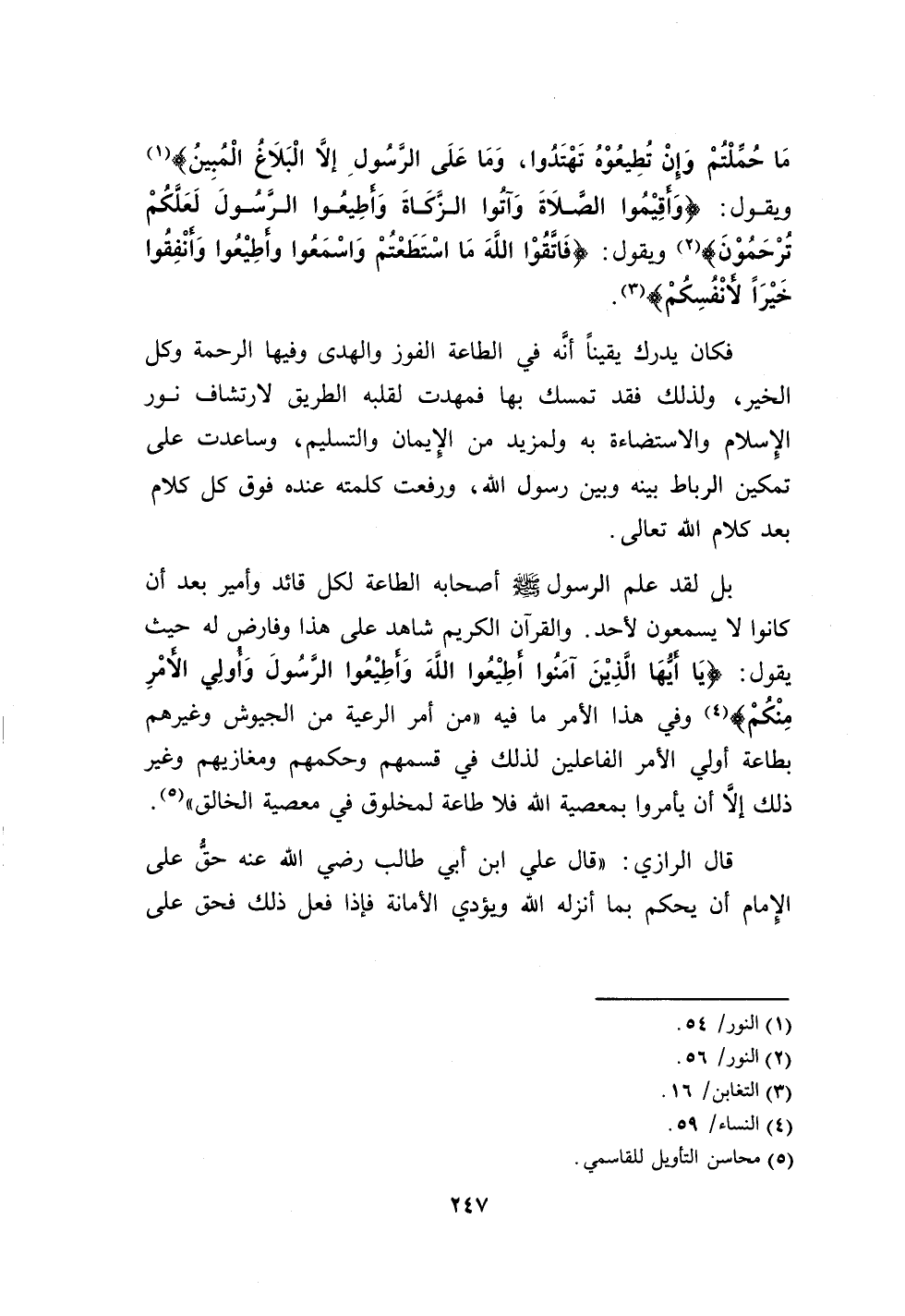 والقرآن الكريم شاهد على هذا وفارض له حيث يقول: (يا أيها الذين آمنوا أطيعوا الله وأطيعوا الرسول وأولي الأمر منكم) (4) وفي هذا الأمر ما فيه " من أمر الرعية من الجيوش وغيرهم بطاعة أولي الأمر الفاعلين لذلك في قسمهم وحكمهم ومغازيهم وغير ذلك إلا أن يأمروا بمعصية الله فلا طاعة لمخلوق في معصية الخالق " (5).