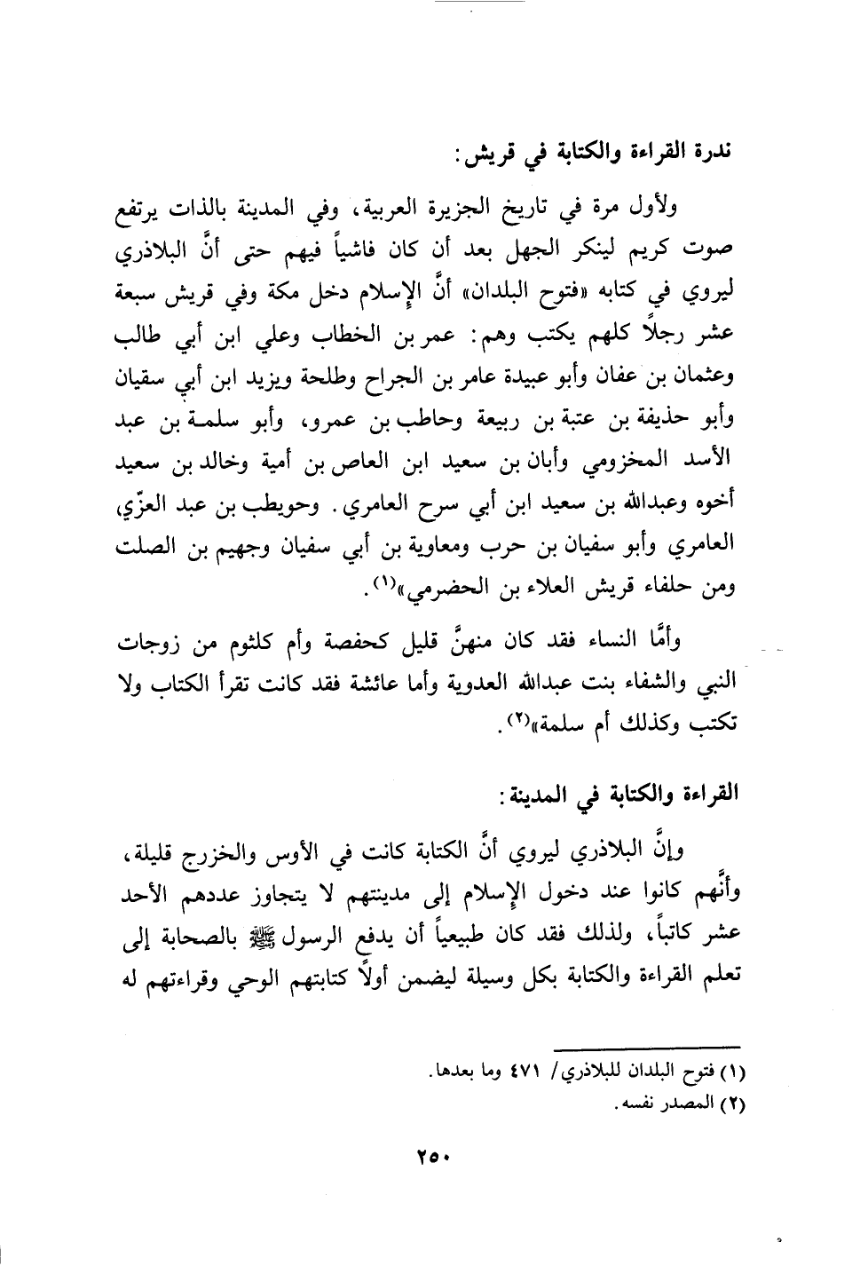 وإن البلاذري ليروي أن الكتابة كانت في الأوس والخزرج قليلة، وأنهم كانوا عند دخول الإسلام إلى مدينتهم لا يتجاوز عددهم الأحد عشر كاتباً، ولذلك فقد كان طبيعياً أن يدفع الرسول صلى الله عليه وسلم بالصحابة إلى تعلم القراءة والكتابة بكل وسيلة ليضمن أولاً كتابتهم الوحي وقراءتهم له…