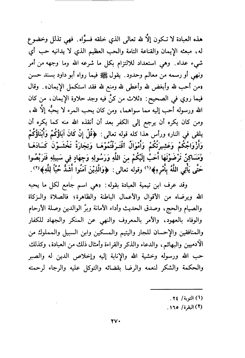 " هي اسم جامع لكل ما يحبه الله ويرضاه من الأقوال والأعمال الباطنة والظاهرة، فالصلاة والزكاة والصيام والحج، وصدق الحديث وأداء الأمانة وبر الوالدين وصلة الأرحام والوفاء بالعهود، والأمر بالمعروف والنهي عن المنكر والجهاد للكفار والمنافقين والإحسان للجار واليتيم والمسكين وابن السبيل والمملوك من الآدميين والبهائم، والدعاء والذكر والقراءة وأمثال ذلك منالعبادة، وكذلك حب الله ورسوله وخشية الله والإنابة إليه وإخلاص الدين له والصبر والحكمة والشكر لنعمه والرضا بقضائه والتوكل عليه والرجاء لرحمته…