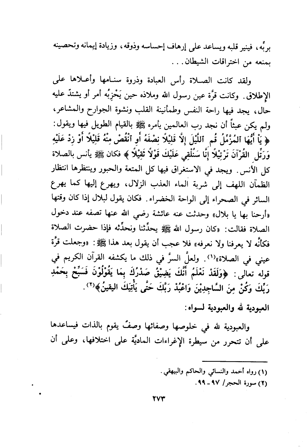 وكانت قرة عين رسول الله وملاذه حين يحزبه أمر أو يشتد عليه حال، يجد فهيا راحة النفس وطمأنينة القلب ونشوة الجوارح والمشاعر، ولم يكن عبثاً أن نجد رب العالمين يأمره صلى الله عليه وسلم بالقيام الطويل فيهاويقول: (يا أيها المزمل قم الليل إلا قليلاً نصفه أو انقص منه قليلاً أو زد عليه ورتل القرآن ترتيلا إنا سنلقي عليك قولاً ثقيلاً) فكان صلى الله عليه وسلم يأنس بالصلاة كل الأنس.