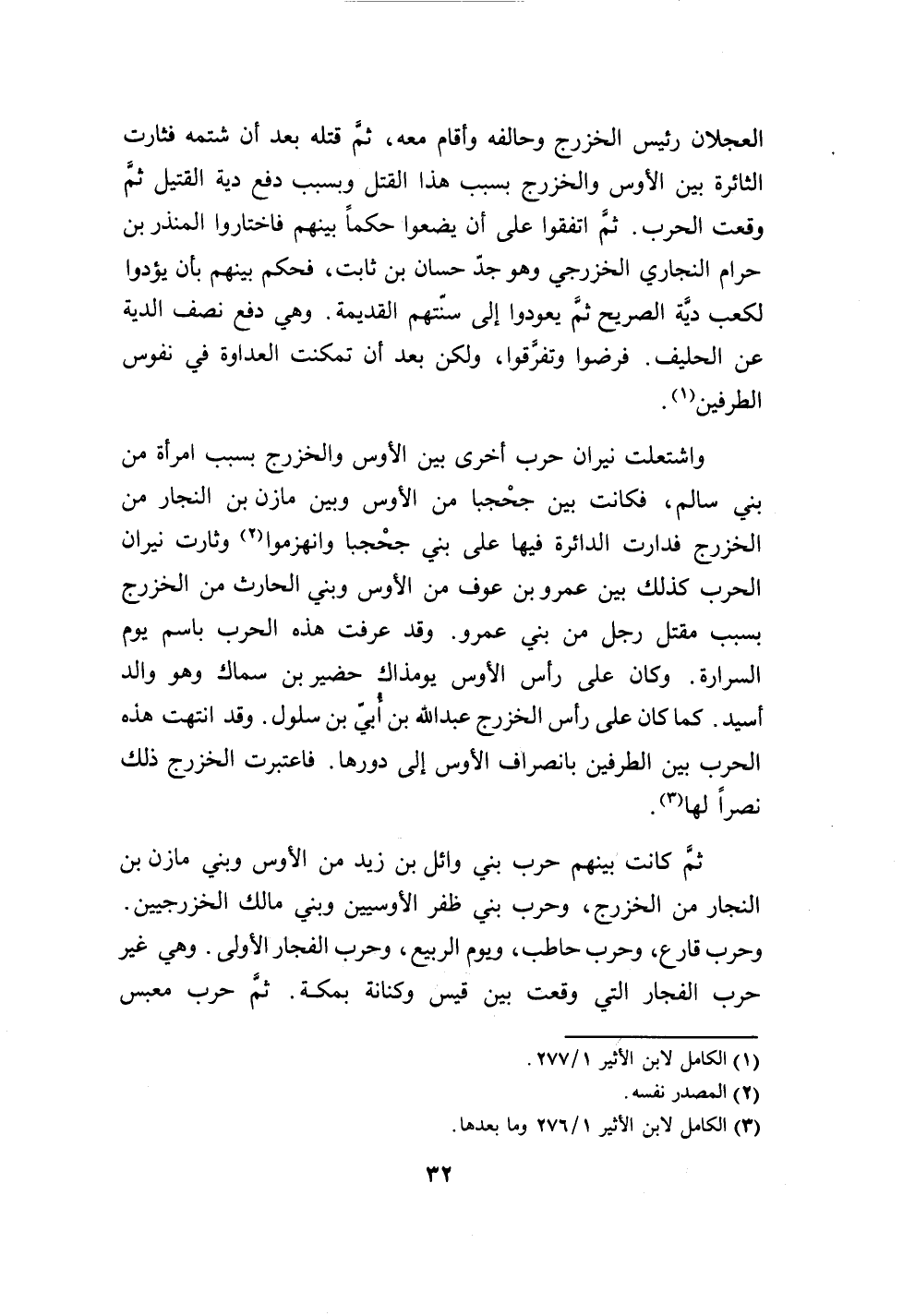 32…العجلان رئيس الخزرج وحالفه وأقام معه، ثم قتله بعد أن شتمه فثارت الثائرة بين الأوس والخزرج بسبب هذا القتل وبسبب دفع دية القتيل ثم وقعت الحرب.