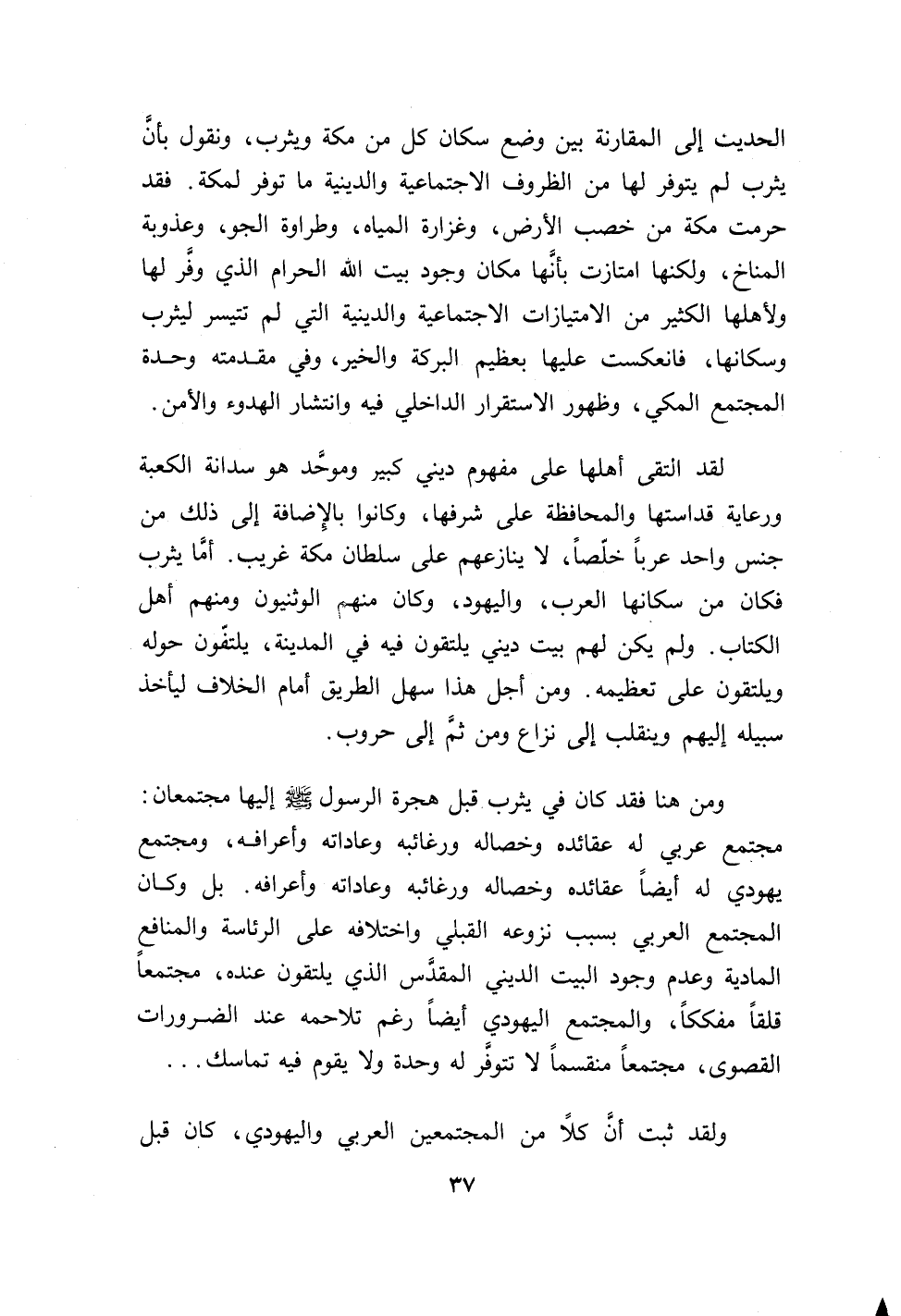 37…الحديث إلى المقارنة بين وضع سكان كل من مكة ويثرب، ونقول بأن يثرب لم يتوفر لها من الظروف الاجتماعية والدينية ما توفر لمكة.