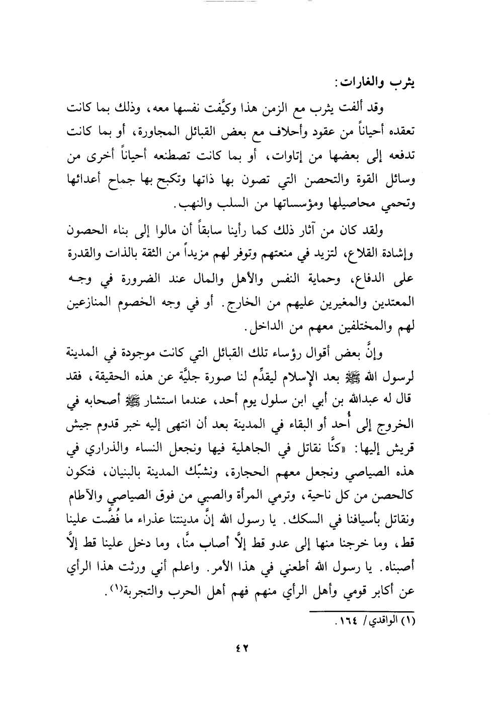 وقد ألفت يثرب مع الزمن هذا وكيفت نفسها معه، وذلك بما كانت تعقده أحياناً من عقود وأحلاف مع بعض القبائل المجاورة، أو بما كانت تدفعه إلى بعضها من إتاوات، أو بما كانت تصطنعه أحياناً أخرى من وسائل القوة والتحصن التي تصون بها ذاتها وتكبح بها جماح أعدائها وتحمي محاصيلها ومؤسساتها من السلب والنهب.