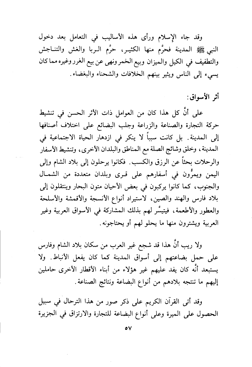 57…وقد جاء الإسلام ورأى هذه الأساليب في التعامل بعد دخول النبي صلى الله عليه وسلم المدينة فحرم منها الكثير، حرم الربا والغش والتناجش والتطفيف في الكيل والميزان وبيع الخمر ونهى عن بيع الغرز وغيره مما كان يسيء إلى الناس ويثير بينهم الخلافات والشحناء والبغضاء.