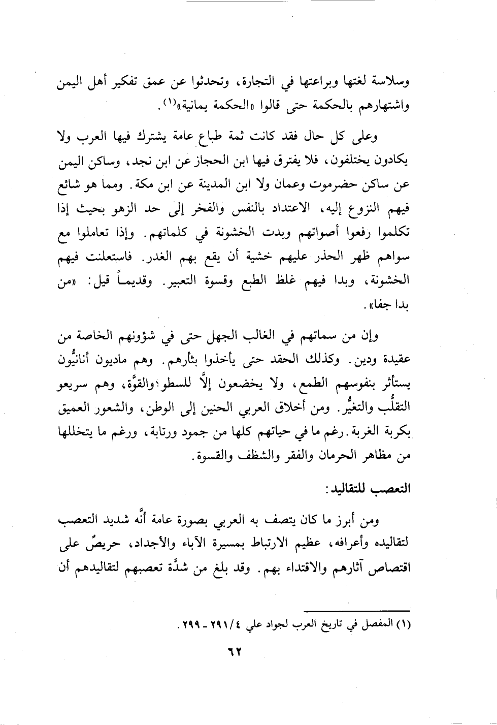 62…وسلاسة لغتها وبراعتها في التجارة، وتحدثوا عن عمق تفكير أهل اليمن واشتهارهم بالحكمة حتى قالوا " الحكمة يمانية " (1).