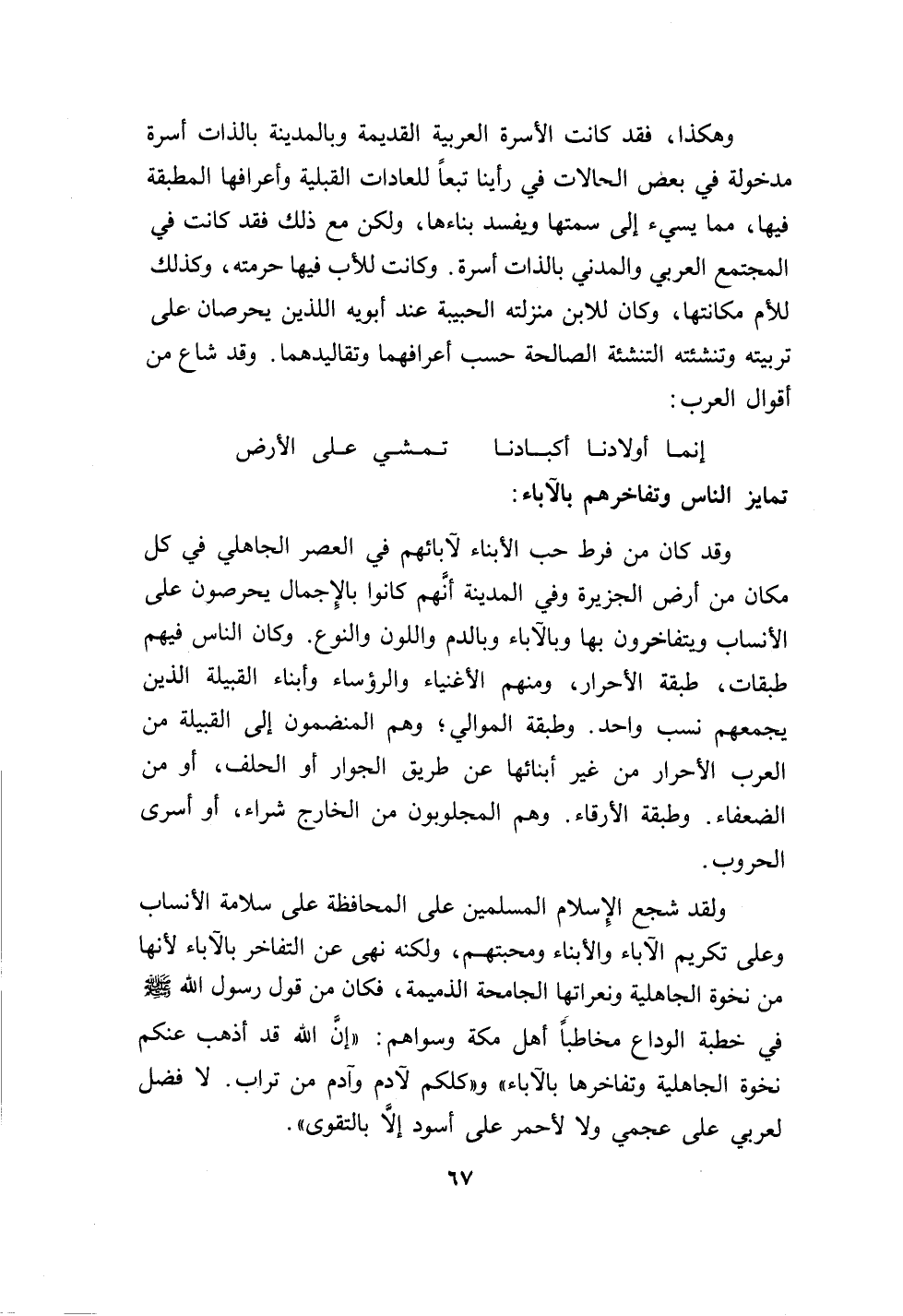 67…وهكذا، فقد كانت الأسرة العربية القديمة وبالمدينة بالذات أسرة مدخولة في بعض الحالات في رأينا تبعاً للعادات القبلية وأعرافها المطبقة فيها، مما يسيء إلى سمتها ويفسد بناءها، ولكن مع ذلك فقد كانت في المجتمع العربي والمدني بالذات أسرة.