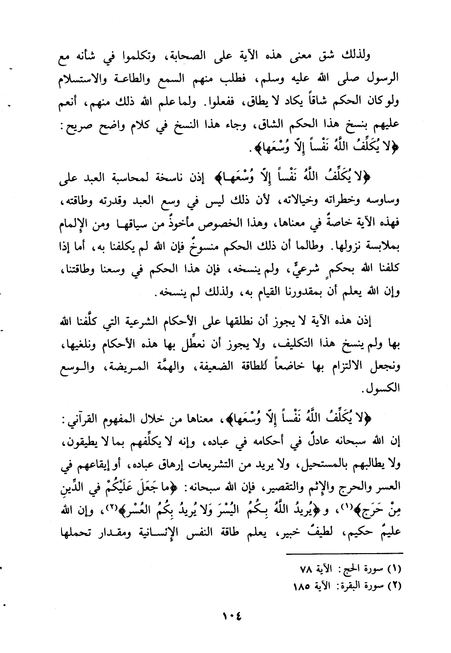 {لا يُكَلِّفُ اللهُ نَفْسًا إِلَّا وُسْعَهَا} إذن ناسخة لمحاسبة العبد على وساوسه وخطراته وخيالاته، لأن ذلك ليس في وسع العبد وقدرته وطاقته، فهذه الآية خاصةٌ في معناها، وهذا الخصوص مأخوذٌ من سياقها ومن الإِلمام بملابسة نزولها. وطالما أن ذلك الحكم منسوخٌ فإن الله لم يكلفنا به، أما إذا كلفنا الله بحكمٍ شرعيٍّ، ولم ينسخه، فإن هذا الحكم في وسعنا وطاقتنا، وإن الله يعلم أن بمقدورنا القيام به، ولذلك لم ينسخه.