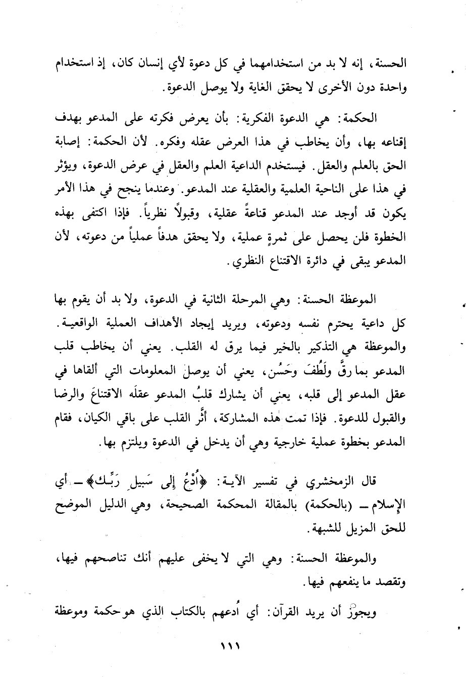 قال الزمخشري في تفسير الآية: {اُدْعُ إِلى سَبيلِ رَبِّك} -أي الإسلام- {بالحكمة} بالمقالة المحكمة الصحيحة، وهي الدليل الموضح للحق المزيل للشبهة.
