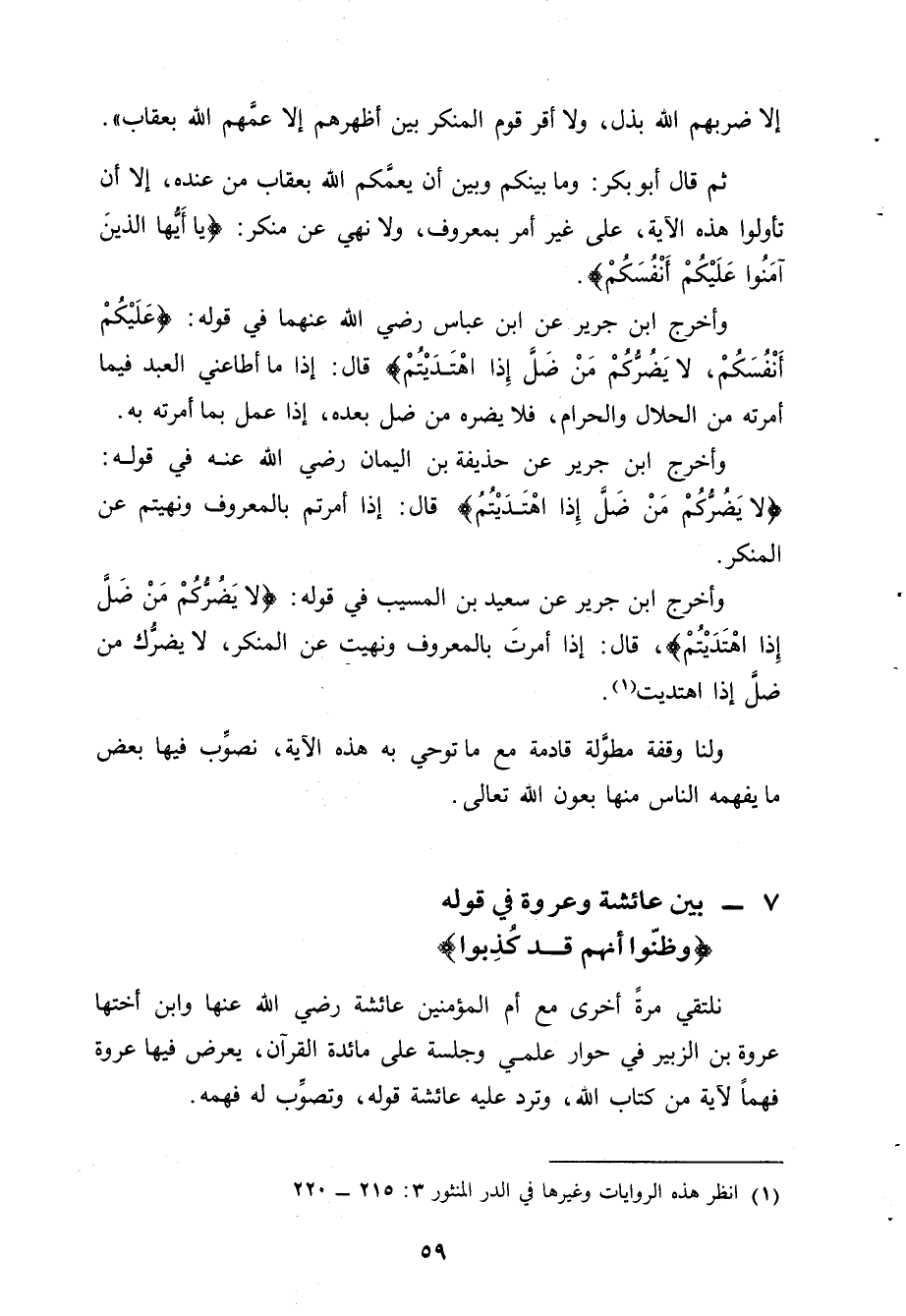 وأخرج ابن جرير عن سعيد بن المسيب في قوله: {لا يَضُرُّكُمْ مَنْ ضَلَّ إِذا اهْتَدَيْتُمْ}، قال: إذا أمرتَ بالمعروف ونهيت عن المنكر، لا يضرُّك من ضلَّ إذا اهتديت.