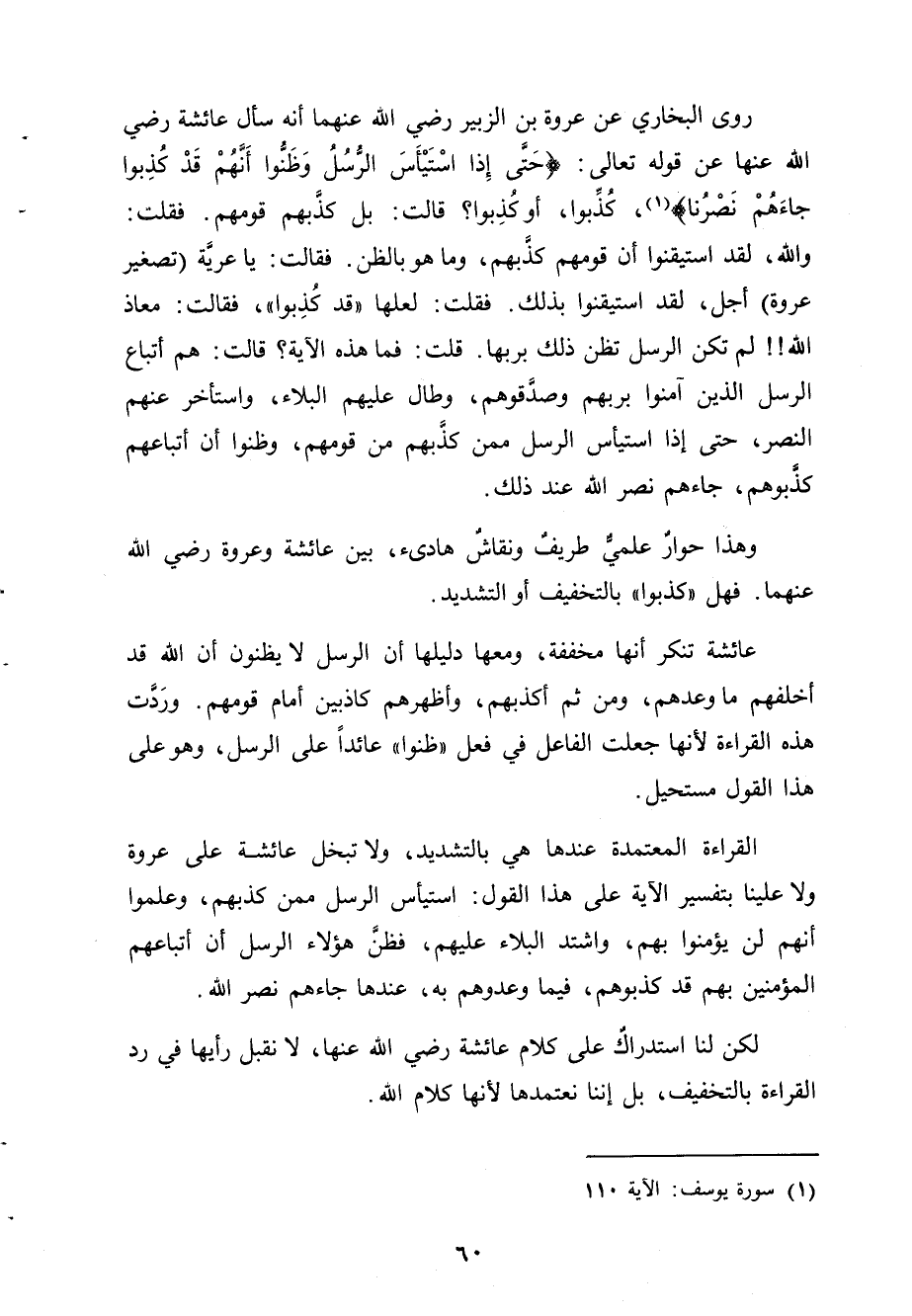 القراءة المعتمدة عندها هي بالتشديد، ولا تبخل عائشة على عروة ولا علينا بتفسير الآية على هذا القول: استيأس الرسل ممن كذبهم، وعلموا أنهم لن يؤمنوا بهم، واشتد البلاء عليهم، فظنَّ هؤلاء الرسل أن أتباعهم المؤمنين بهم قد كذبوهم، فيما وعدوهم به، عندها جاءهم نصر الله.