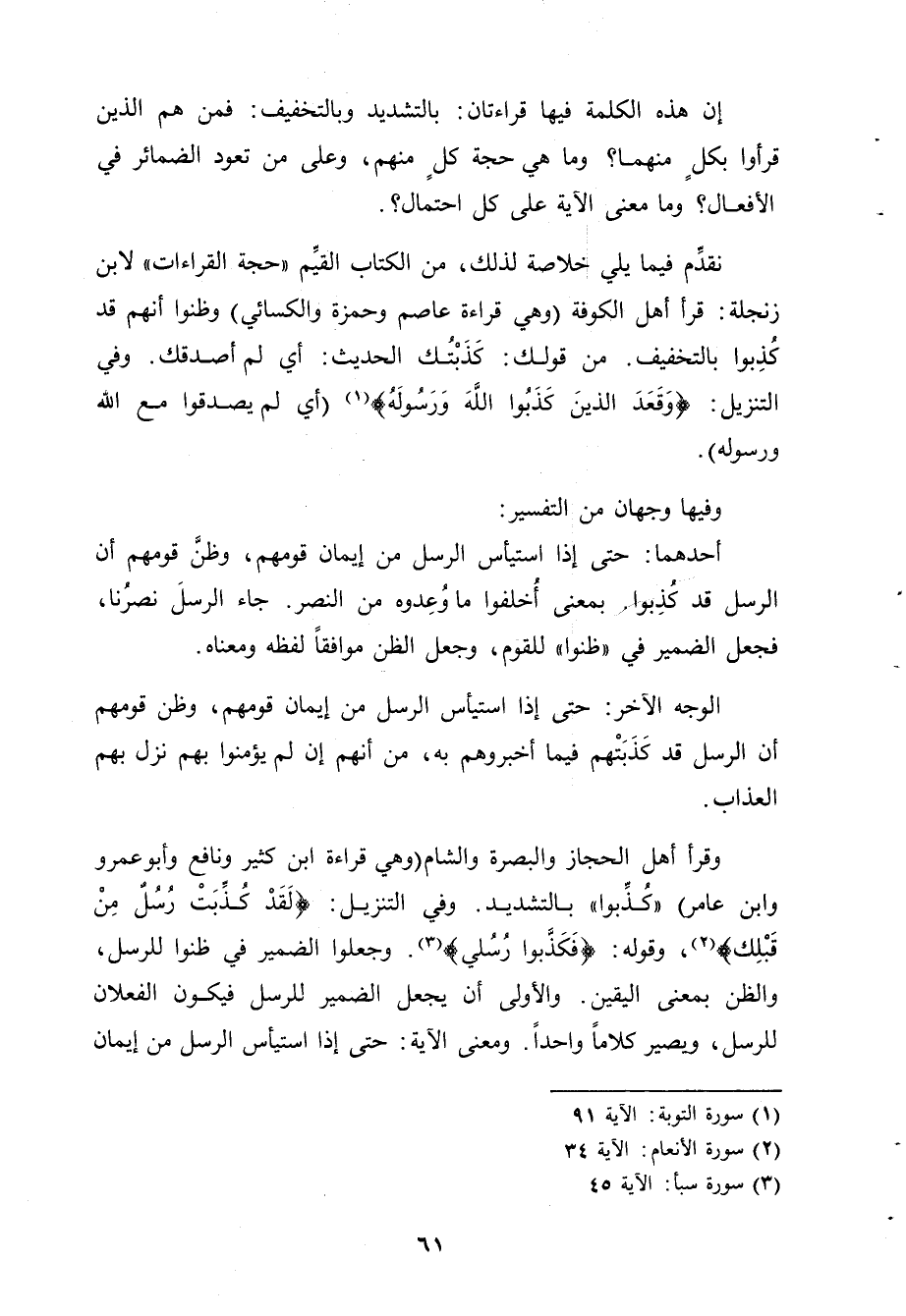 نقدم فيما يلي خلاصة لذلك، من الكتاب القيِّم " حجة القراءات " لابن زنجلة: قرأ أهل الكوفة (وهي قراءة عاصم وحمزة والكسائي) وظنوا أنهم قد كُذِبوا بالتخفيف. من قولك: كَذَبْتُك الحديث: أي لم أصدقك. وفي التنزيل: {وَقَعَدَ الذينَ كَذَبُوا اللهَ وَرَسُولَهُ} (أي لم يصدقوا مع الله ورسوله).