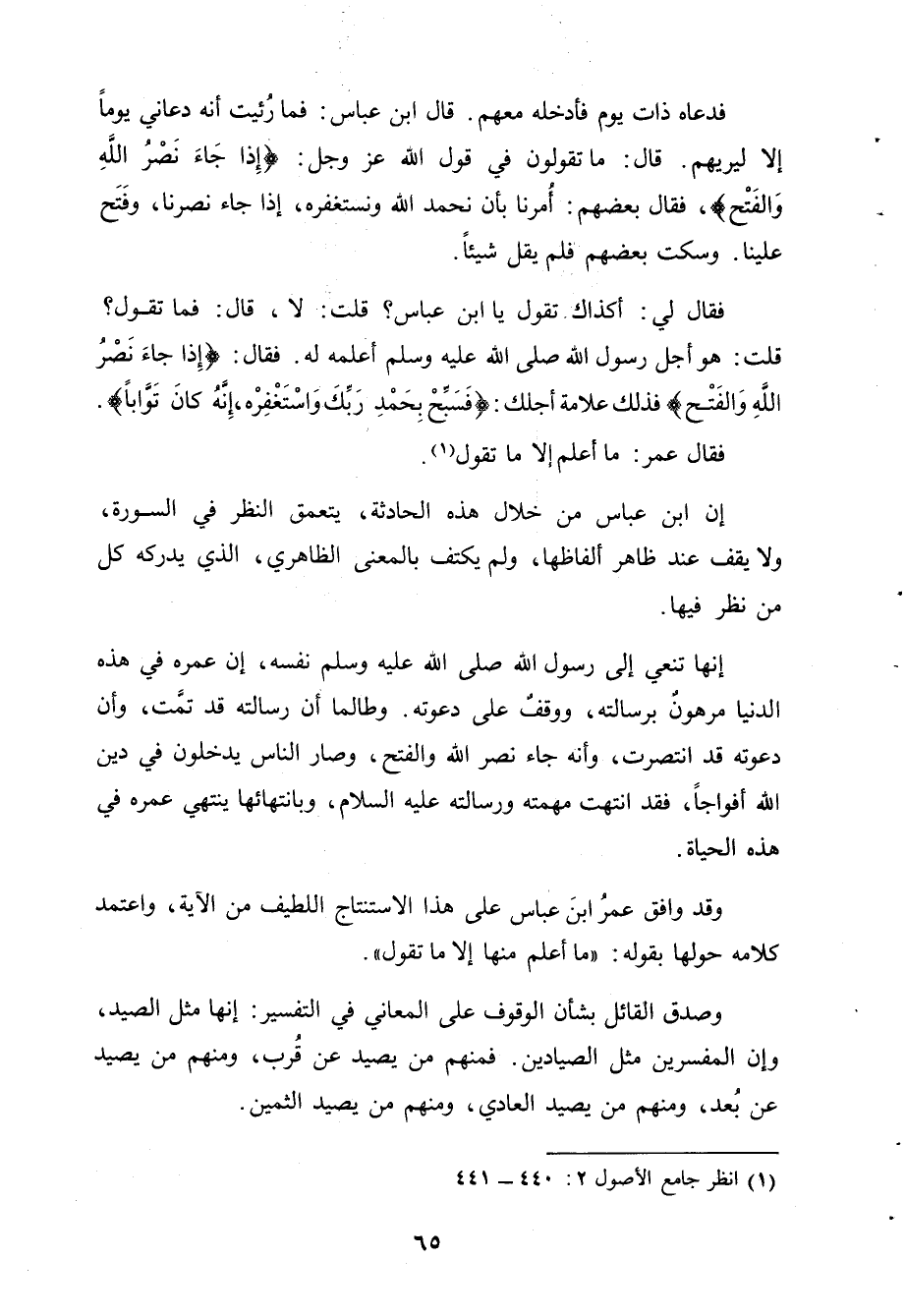 فدعاه ذات يوم فأدخله معهم. قال ابن عباس: فما رُئيت أنه دعاني يوماً إلا ليريهم. قال: ما تقولون في قول الله عز وجل: {إِذا جَاءَ نَصْرُ اللهِ وَالفَتْح}، فقال بعضهم: أُمرنا بأن نحمد الله ونستغفره، إذا جاء نصرنا، وفَتَح علينا. وسكت بعضهم فلم يقل شيئاً.