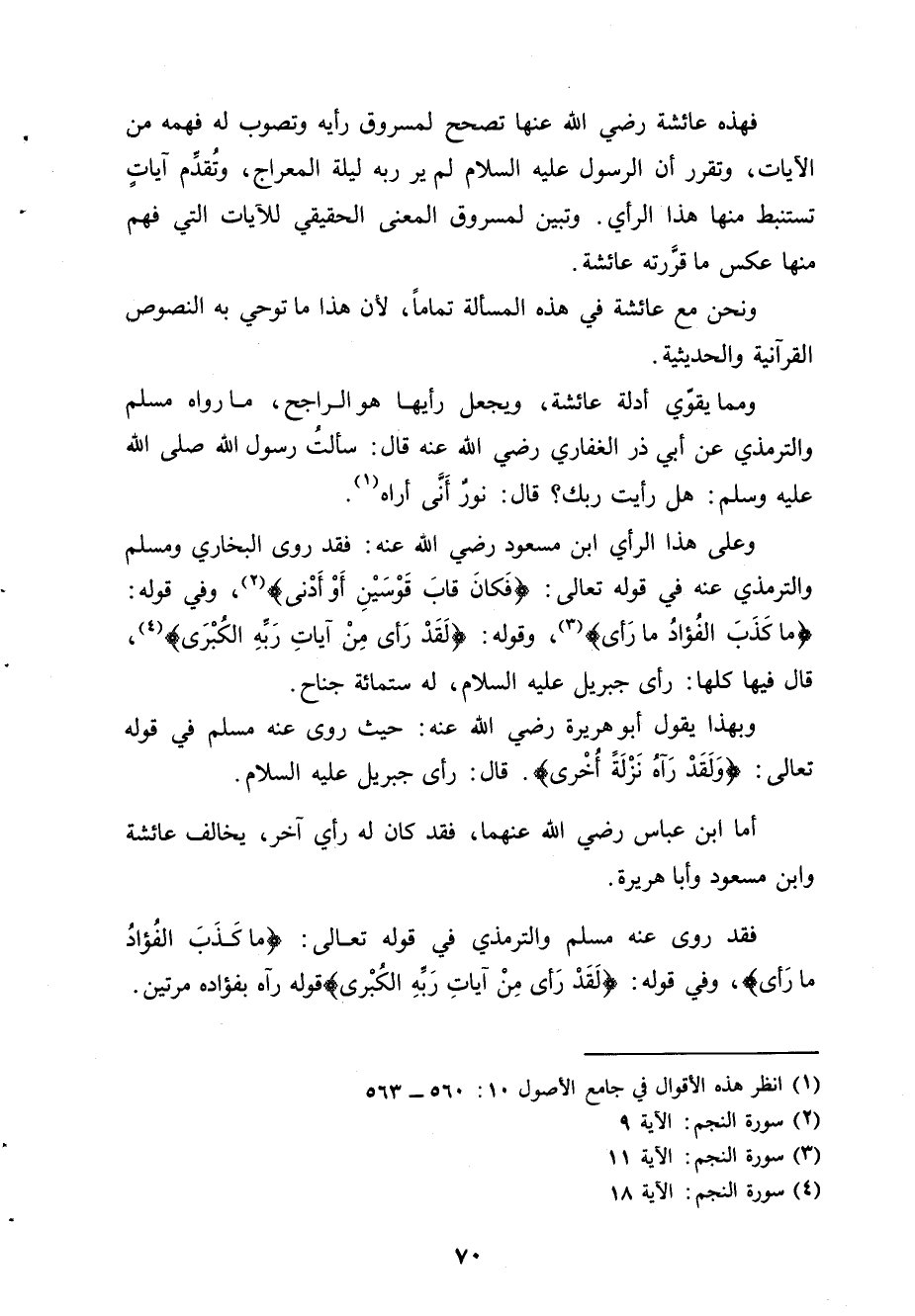 ومما يقوّي أدلة عائشة، ويجعل رأيها هو الراجح، ما رواه مسلم والترمذي عن أبي ذر الغفاري رضي الله عنه قال: سألتُ رسول الله صلى الله عليه وسلم: هل رأيت ربَّك؟ قال: نورٌ أَنَّى أراه.