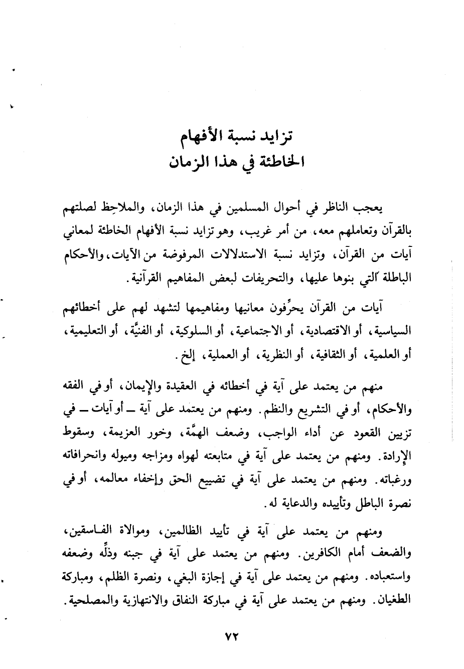 منهم من يعتمد على آية في أخطائه في العقيدة والإيمان، أو في الفقه والأحكام، أو في التشريع والنظم. ومنهم من يعتمد على آية -أو آيات- في تزيين القعود عن أداء الواجب، وضعف الهمَّة، وخور العزيمة، وسقوط الإرادة. ومنهم من يعتمد على آية في متابعته لهواه ومزاجه وميوله وانحرافاته ورغباته. ومنهم من يعتمد على آية في تضييع الحق وإخفاء معالمه، أو في نصرة الباطل وتأييده والدعاية له.